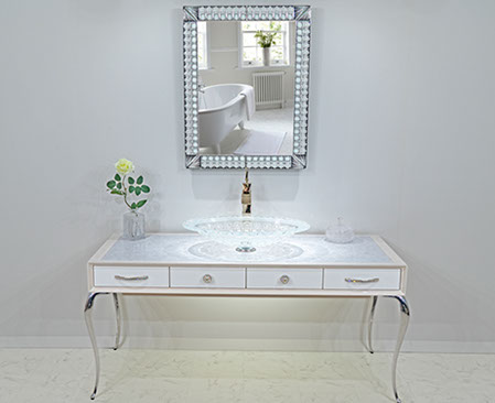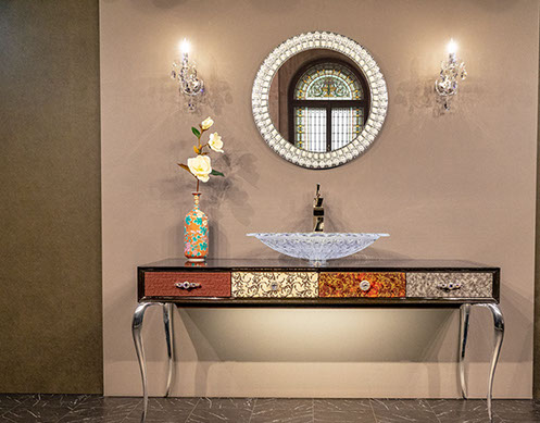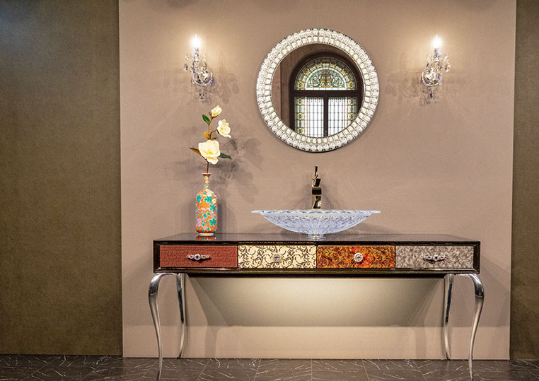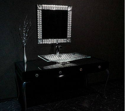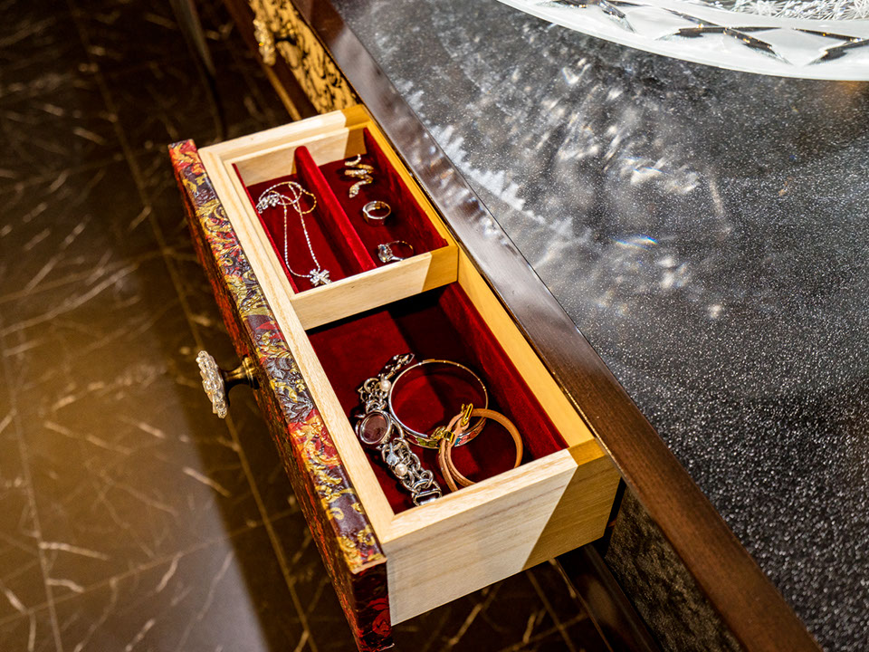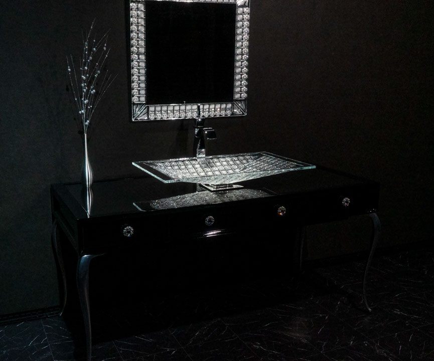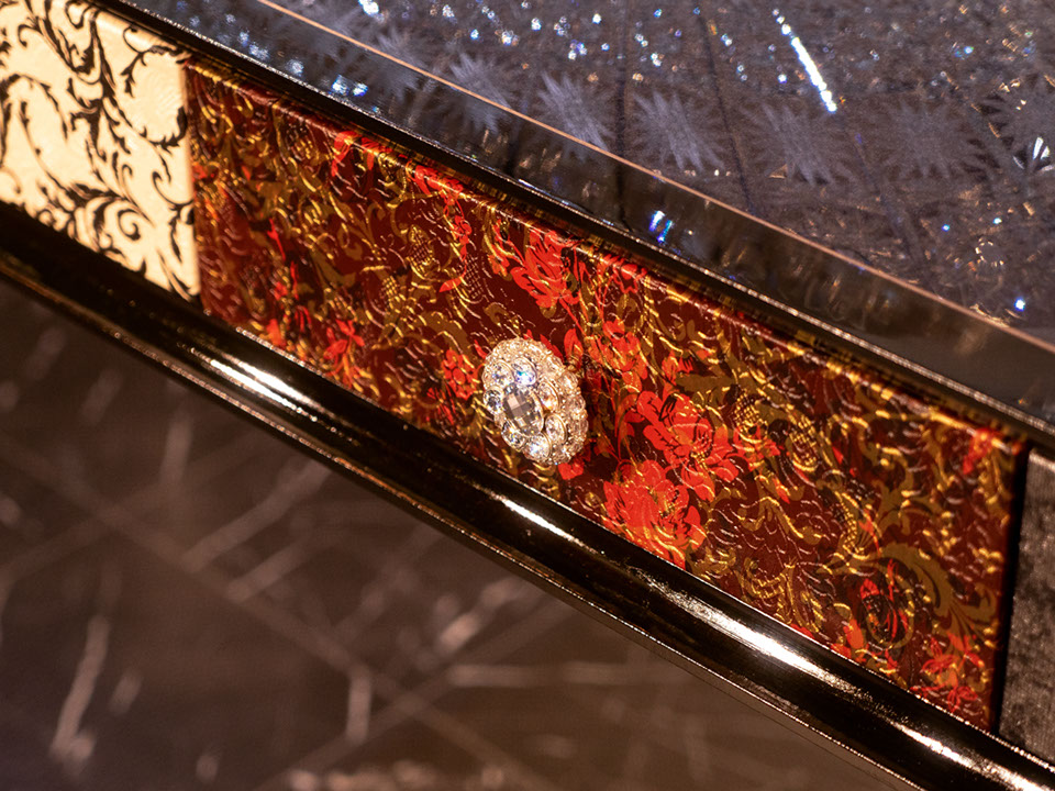 High quality material and a sinuous shape for a classically inspired console, here reinterpreted in a contemporary spirit. Always a fan of asymetry, the different faces to each drawer keeps this arrangement from being static. Wooden frame wrapped in fabulously extravagant leather, decorated with Swarovski crystal knobs and handles. Cabriole legs are made of die- cast aluminum in a polished finish.