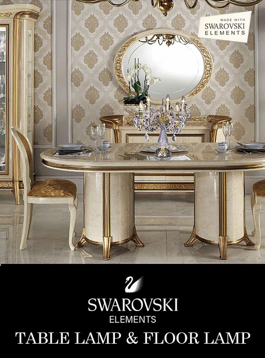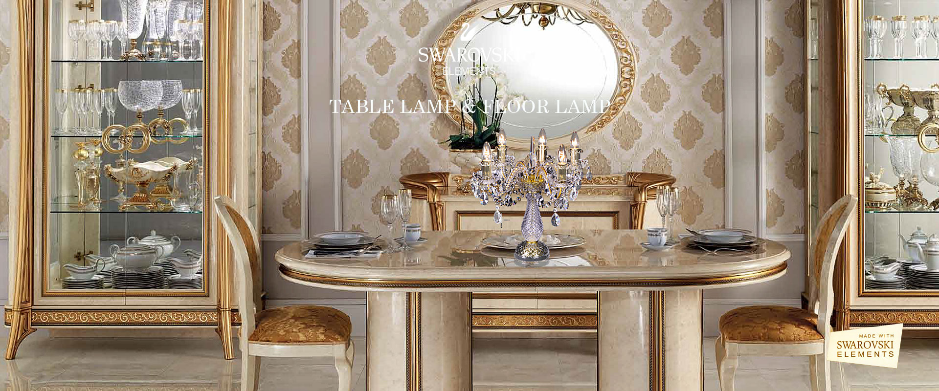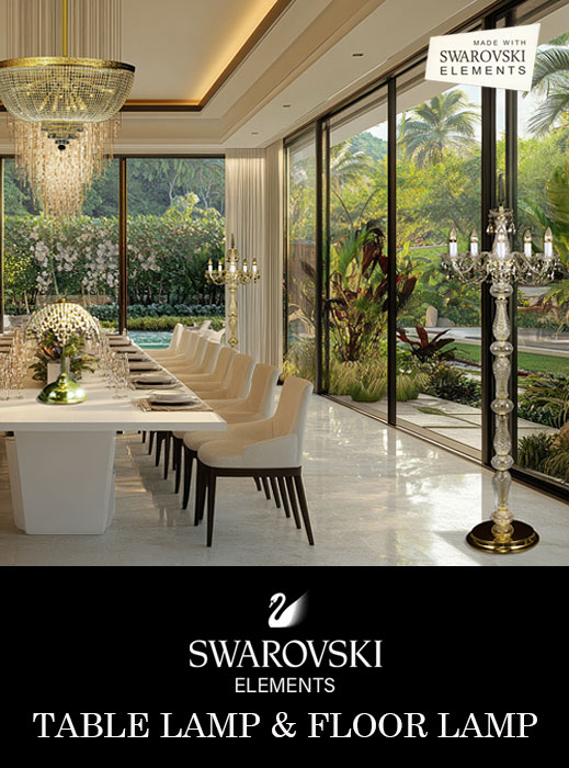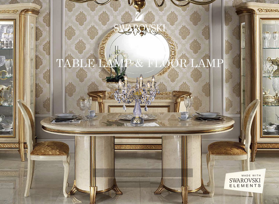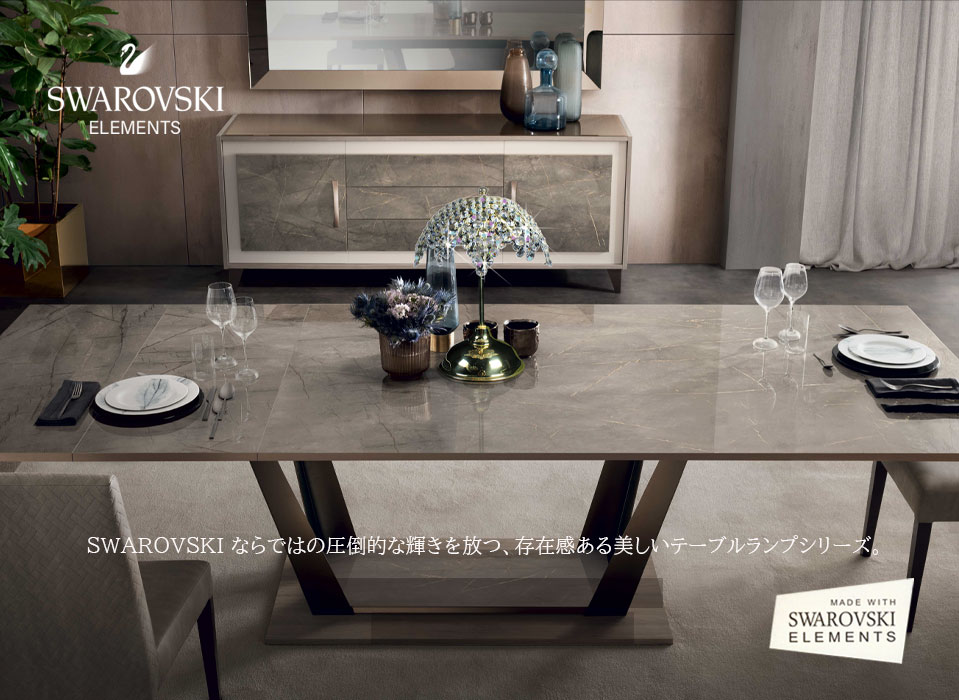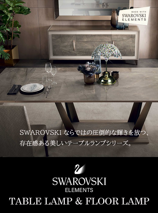 ヨーロッパ伝統のクラッシックフレームモデル、「SWAROVSKI ELEMENTS」のドロップが美しく輝く格調高いシリーズです。リビングテーブルランプとして、フロアーランプはリビング、ベットルームなどを美しいアクセントで演出いたします