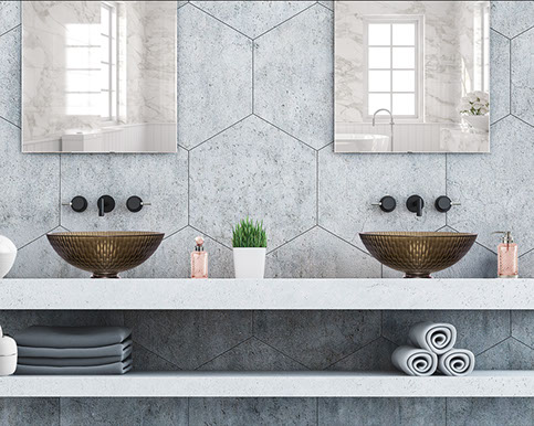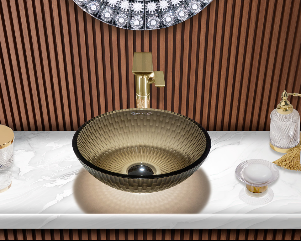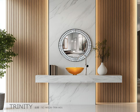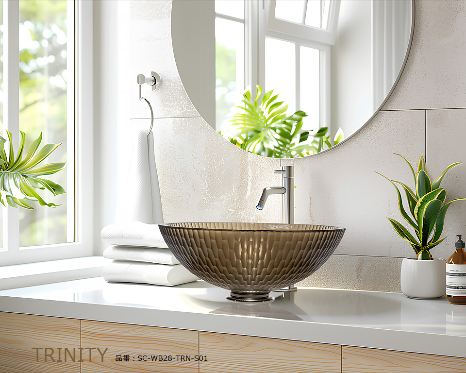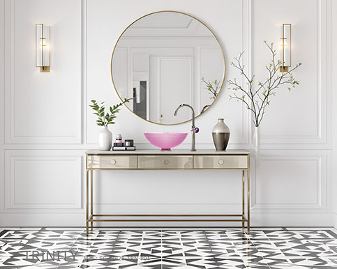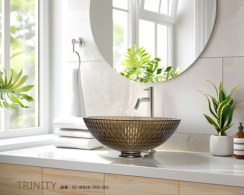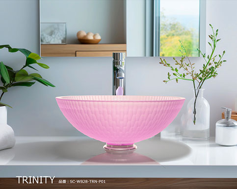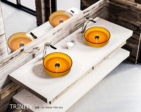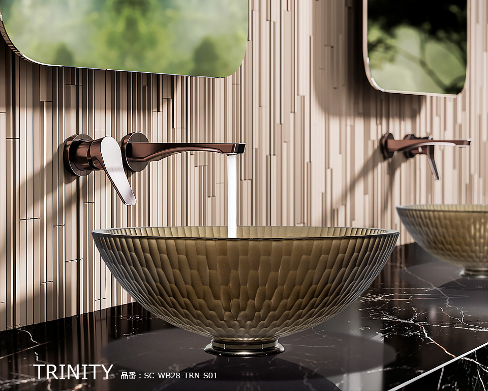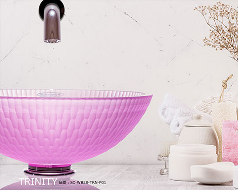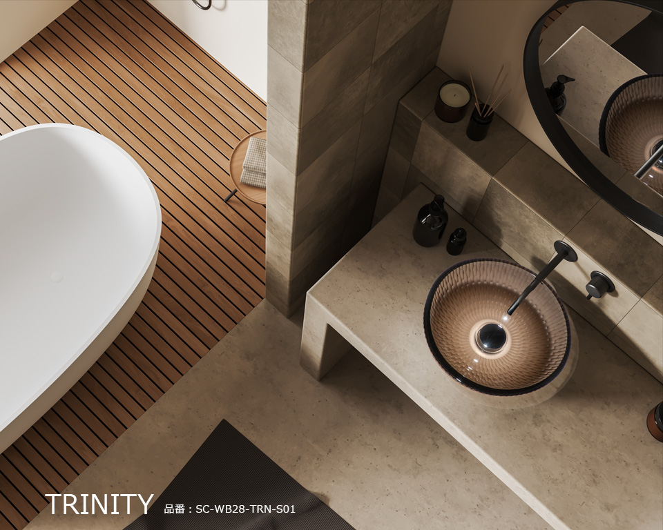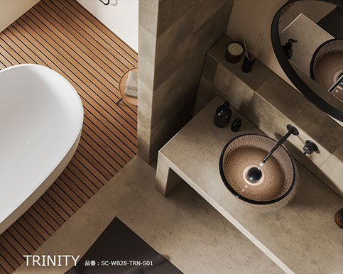 伝統的な亀甲柄と柔らかなラウンドフォルムという、2つの要素が融合し、気品あふれる存在感を放つトリニティーラウンド。カラーリングの選択によって、都会的でモダンな表現にも、どこか懐かしいレトロな趣にも姿を変え、手洗いの空間を豊かに彩ります。