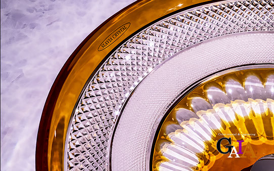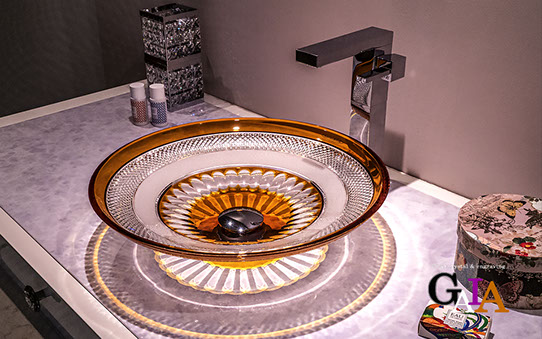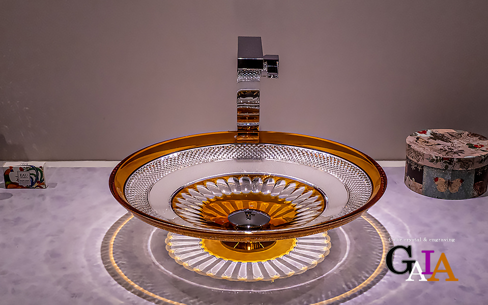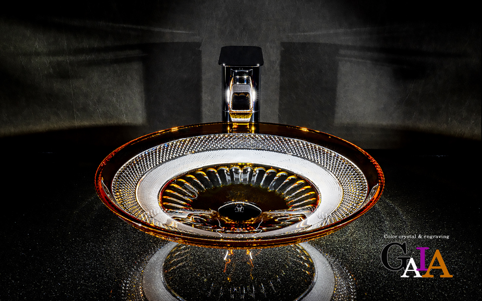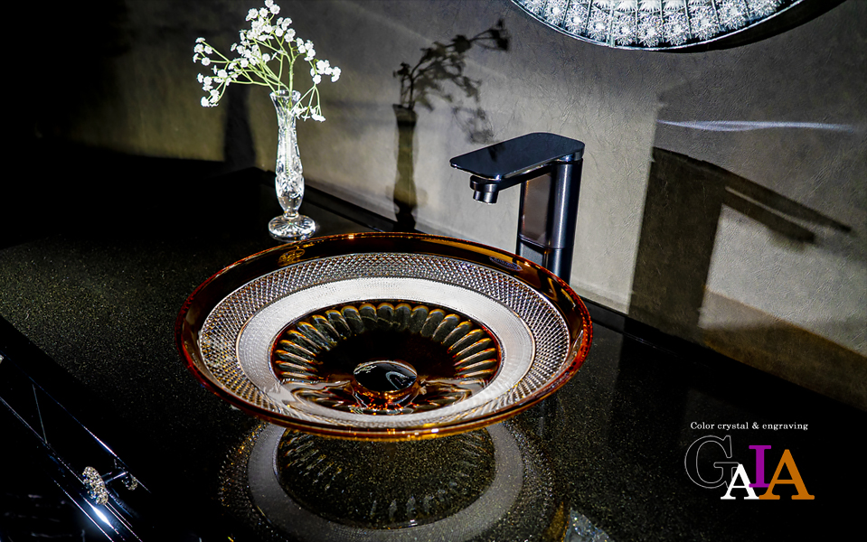 ガイア・アンバー(琥珀)はコンテンポラリーなデザインにクラシカルな魅力を加えた味わい深い逸品。優しい色合いに光が差し、空間に琥珀色の柔らかな陰影を映します。プレスガラスでは真似できない繊細なハンドカッティング(彫刻)に加え、カラー部分のカッティングとクリアー部分のカッティングは相反する輝きで、見る者を感動させます。きせガラスとハンドカッティングという非常に手間のかかる工法で製造される本商品。最高級の空間にふさわしい、重厚かつ繊細な洗面ボウルです。
