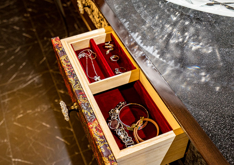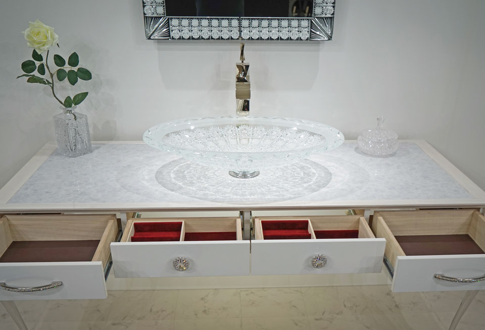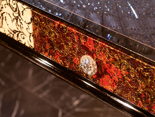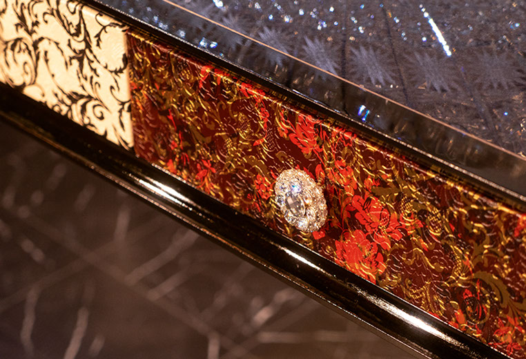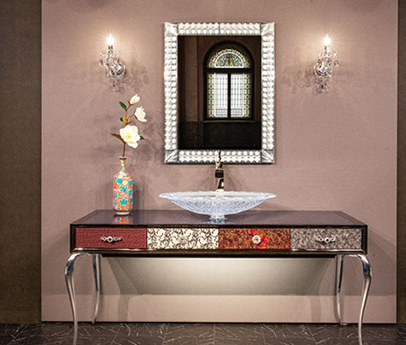 High quality material and a sinuous shape for a classically inspired console, here reinterpreted in a contemporary spirit. Always a fan of asymetry, the different faces to each drawer keeps this arrangement from being static. Wooden frame wrapped in fabulously extravagant leather, decorated with Swarovski crystal knobs and handles. Cabriole legs are made of die- cast aluminum in a polished finish.