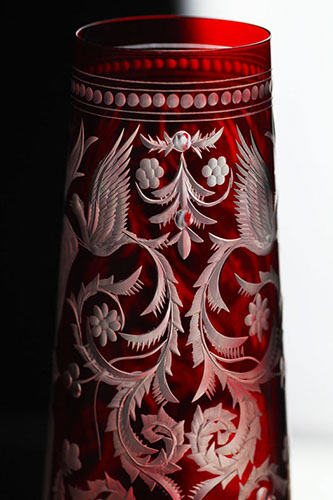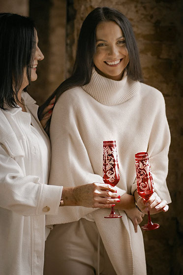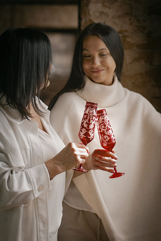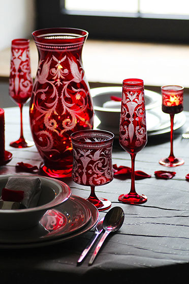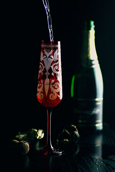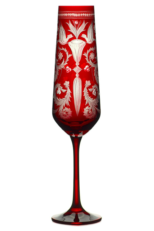 ハンドカットされたガーネット色のシャンパングラスが、リッチで洗練された装飾を際立たせます。 セットテーブルには、EVPAS ガーネットのボトルや同じラインの他の製品を追加することをお勧めします。 この装飾はガラス工場の設立時にすでに作成されていました。 その人気と時代を超越したデザインにより、EVPAS ブランドの代名詞となっています。