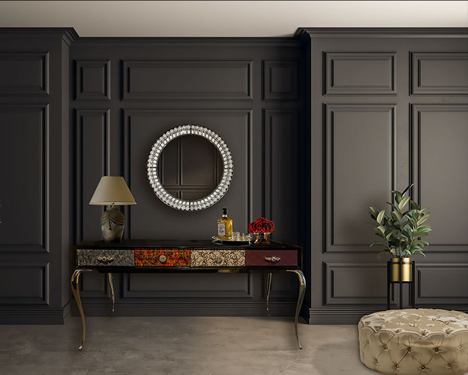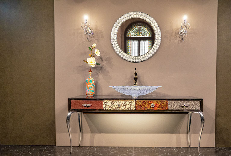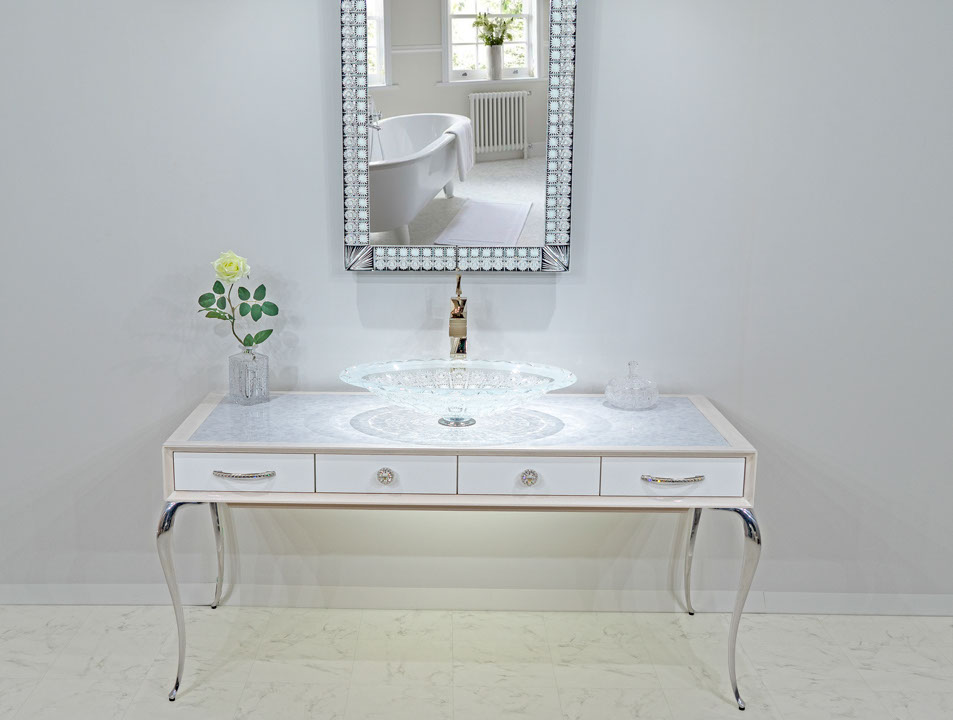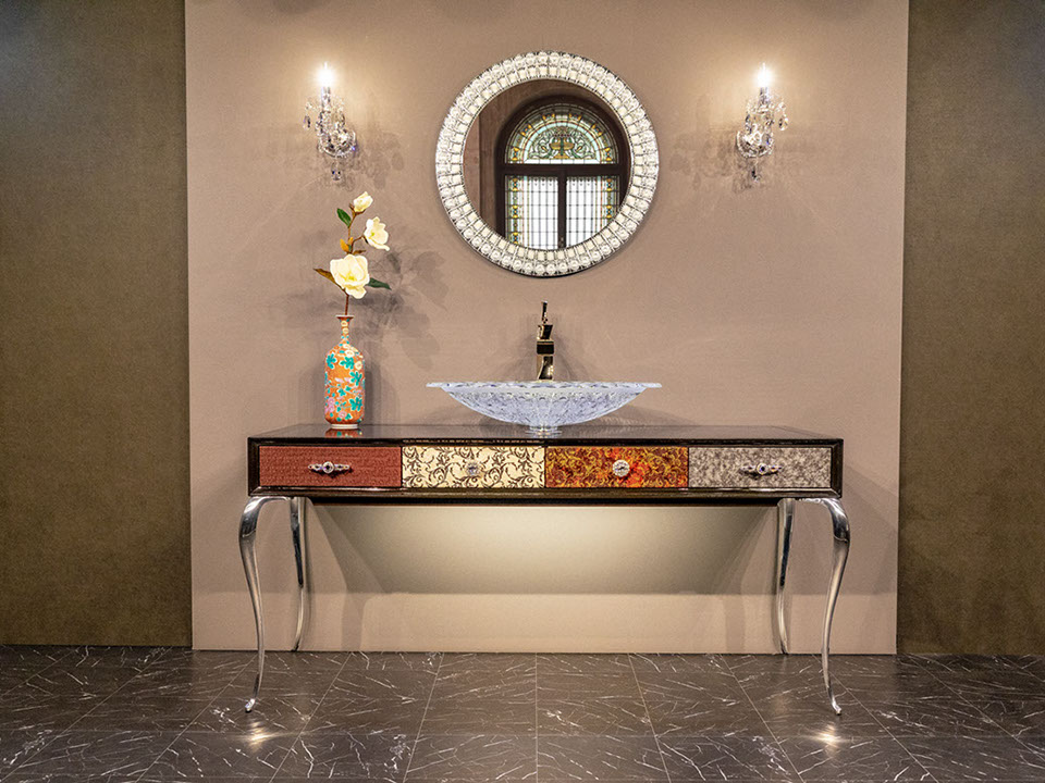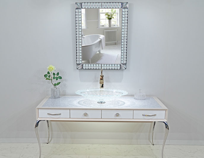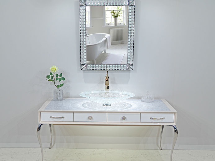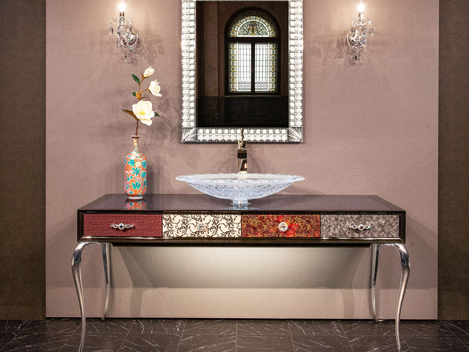 美しい曲線を描く優美なフォルムの猫足と、ワイド1600mmの余裕を持って使える天板部分と4箇所に収納を設けた引き出し部分、スタイリッシュな選択が可能な各素材とカラー。 あなたのお好み通りに空間に合わせた演出が可能になる美しいコンソールです。 洗面台、通常のインテリアコンソールどちらでも製作できます。