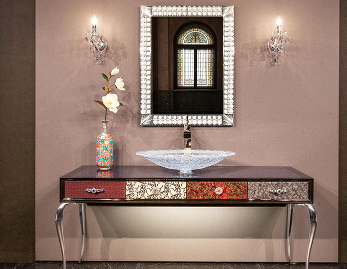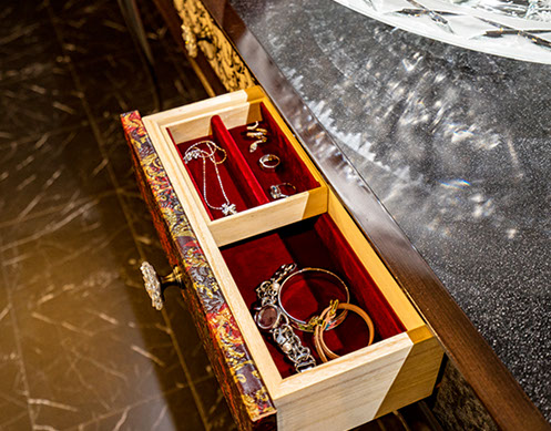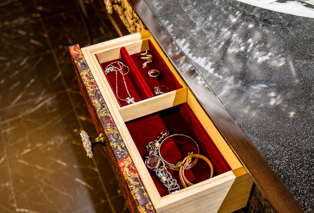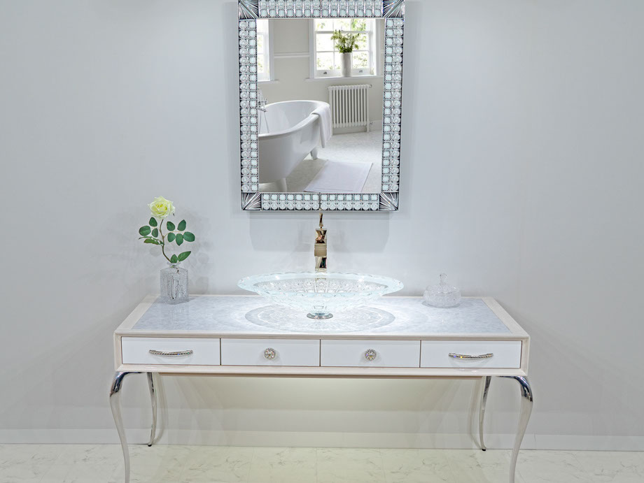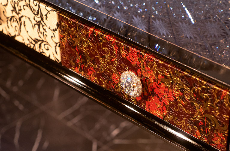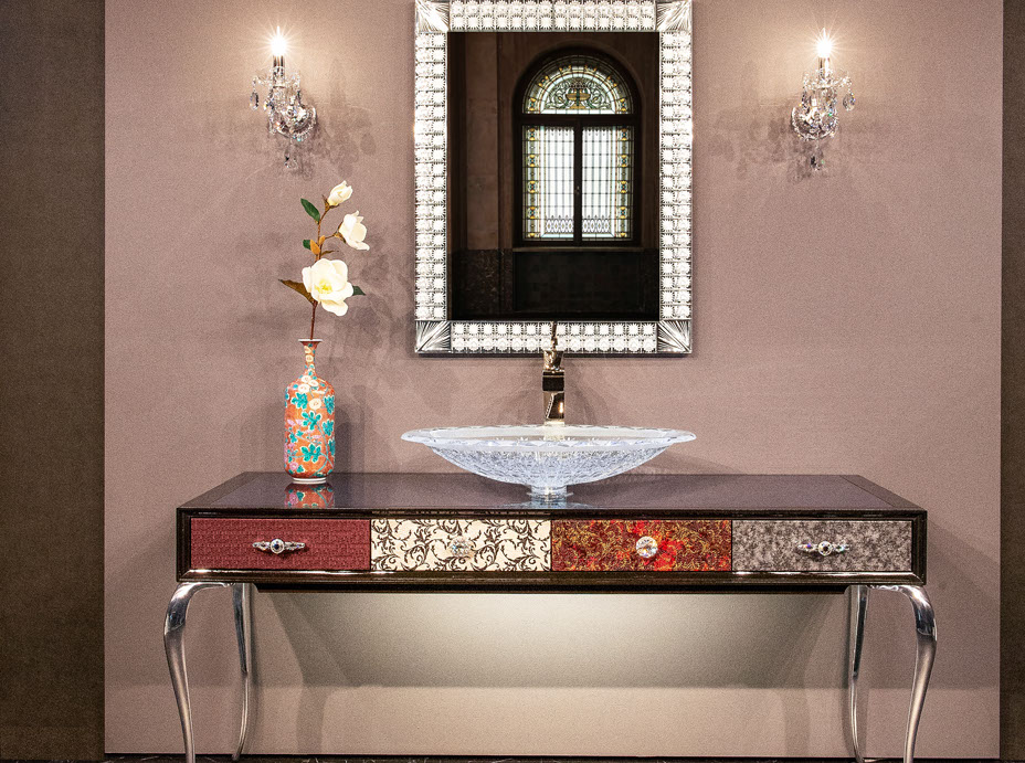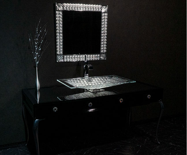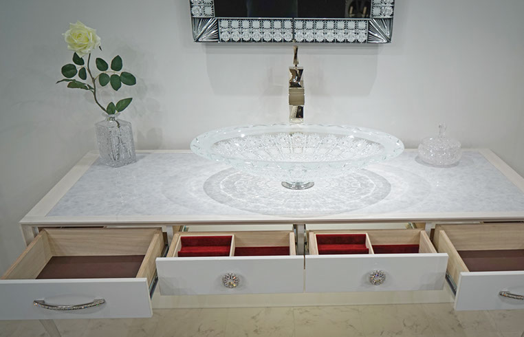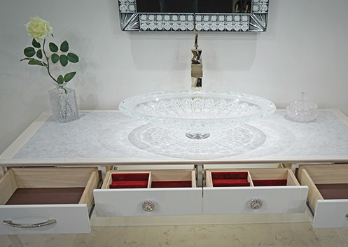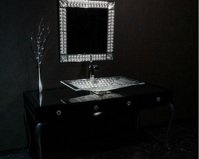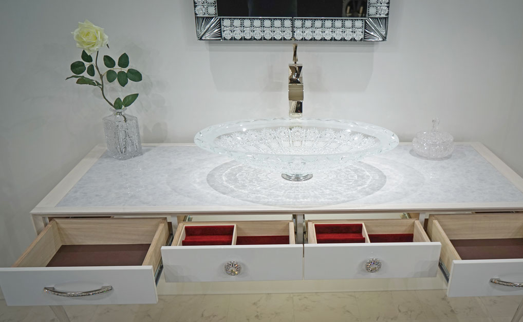 製作例: グレースグランデ : フレームカラー / ピアノブラック : 引き出しパネル 張地 / レガート レッド(皮革): 天板素材 スターギャラクシー(石材): つまみノブ オリジナル スワロフスキークリスタル ノブ SCN897/SCBP006 : 洗面ボウル GAIA RUBIN (ガイア ルビン) : 水栓 ヨルガー PLATEAU(プラトウー)ゴールドレバー / マットブラック本体)