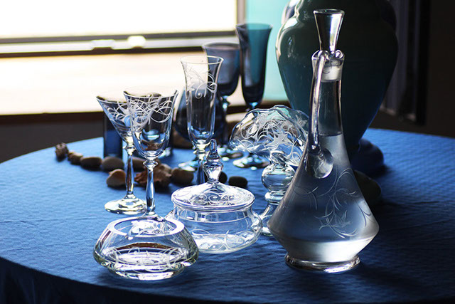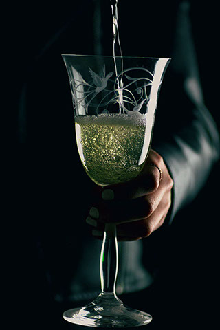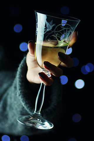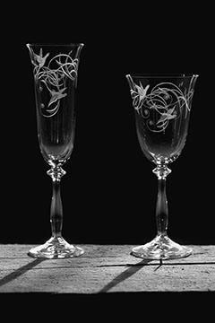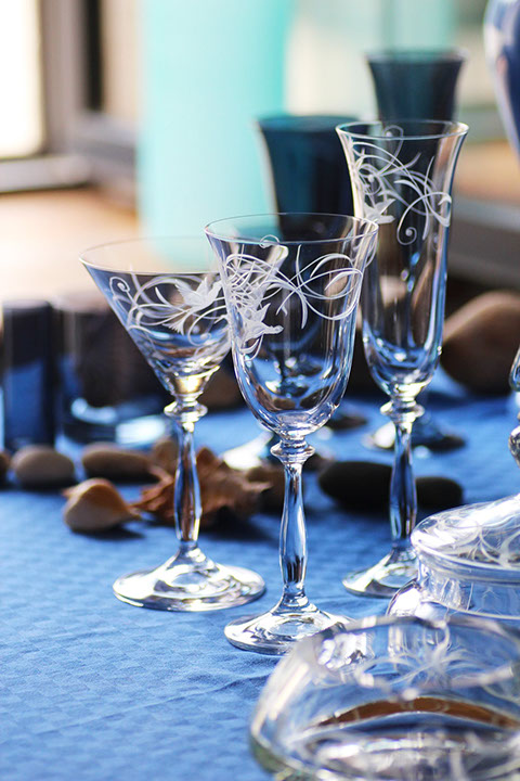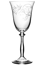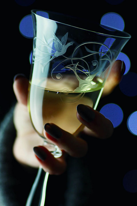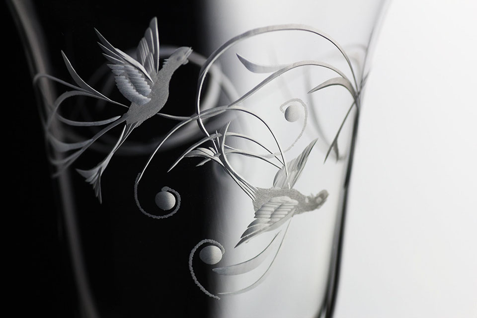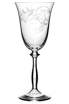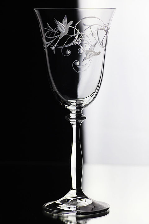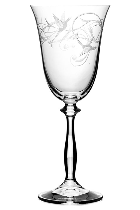 小鳥の繊細な彫刻と絡み合うラインが施された白ワイン用のクリスタルグラスは、飲むたびにテーブルを美しく彩ります。