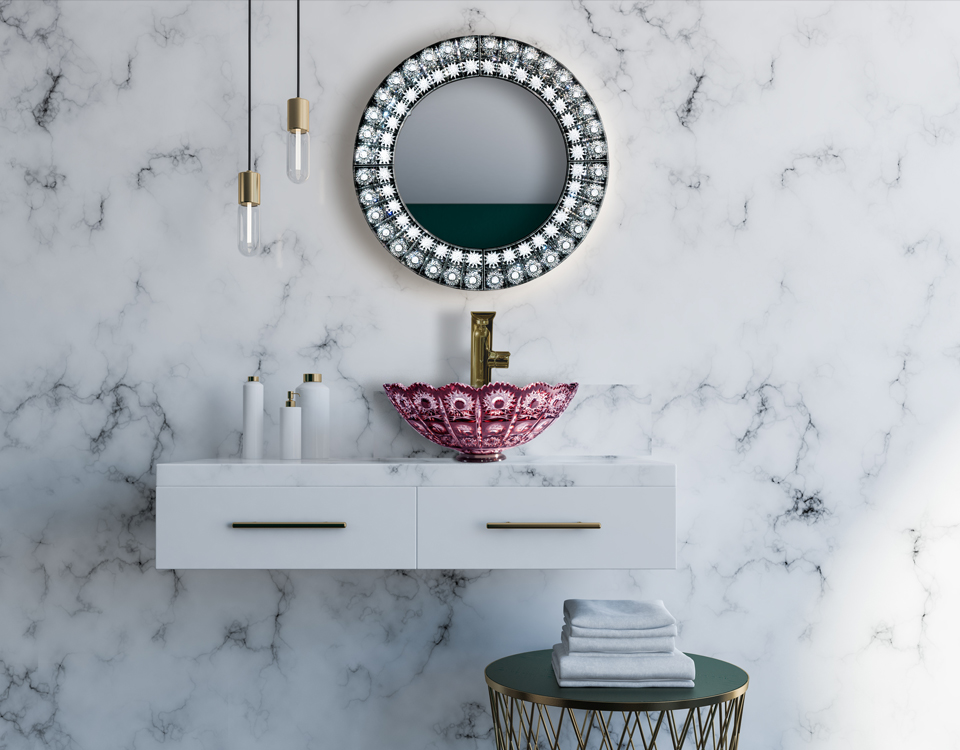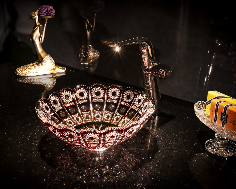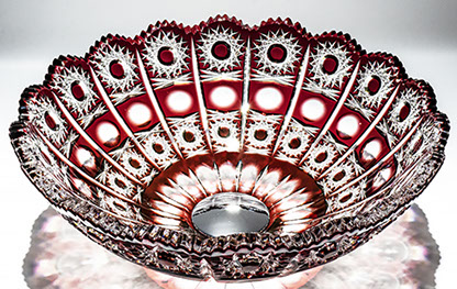 QUEEN(クイーン)は、ドレスの裾のように花びら型にエッジをカットした、可憐で華やかなデザイン。RUBIN(ルビン)はその中でも最もエレガントな魅力を放つ、スペシャルプロダクトです。ワインレッドに近い上質な赤色のルビーレッドを、伝統の被せ(きせ)ガラスの技法を用いてクリスタルのボウルにし、さらにクリスタルガラス本来の美しい輝きとエッジにまでこだわった超繊細なカッティングを施しました。 ボヘミアガラス芸術史上、永遠のベストセラーカットである500pk(Elizabethエリザベス)を更に可憐にデコレーションした、究極のモデルです。 こだわりの色彩と、華やかなデザイン、伝統に裏打ちされたカッティング技巧をご堪能下さい。