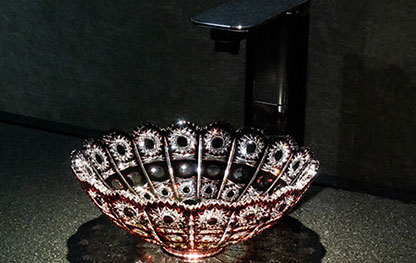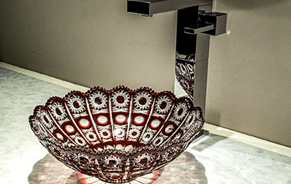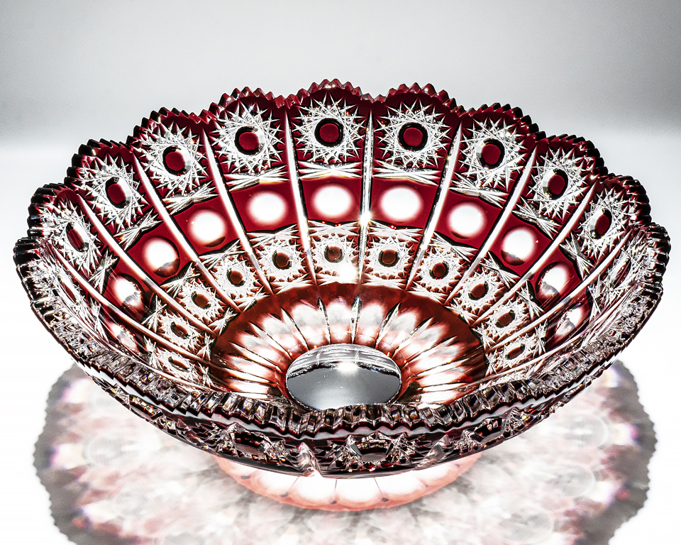 19世紀半ばに、ガラス職人クラリクによって様々な色のアラバスターガラスが発明されました。有色ガラスを利用した技法の一つには、ガラスの生地に有色ガラスを重ね、カットやグラヴィール彫刻を施していく「被せガラス」があります。こちらのRUBINはその装飾技法を用いた伝統の産物。19世紀には輸出用の登録商標として「ボヘミア・クリスタル」という名称が考案され、ガラス芸術品としてブランド・イメージの向上に大きな役割を果たしました.