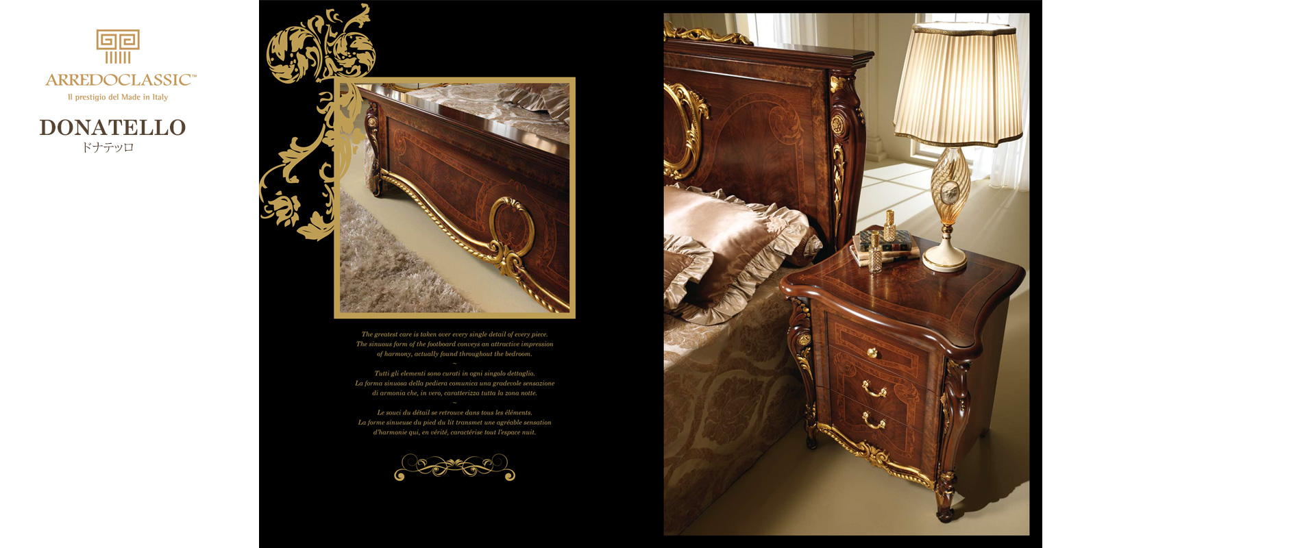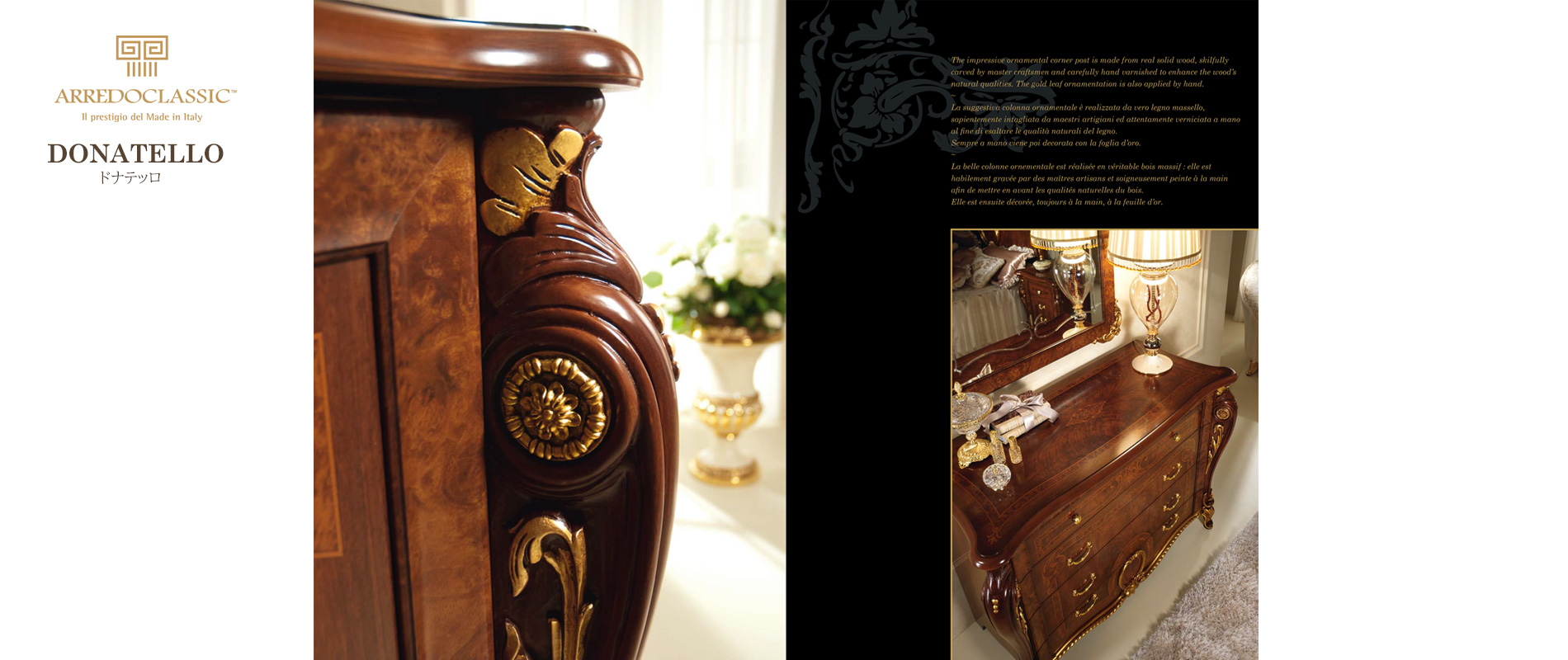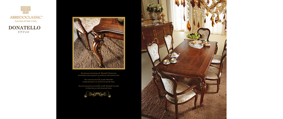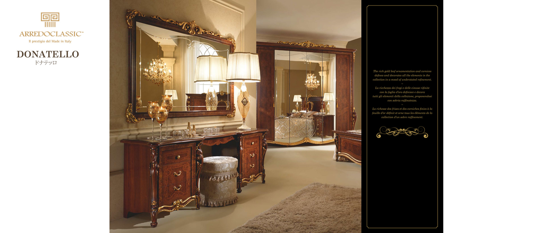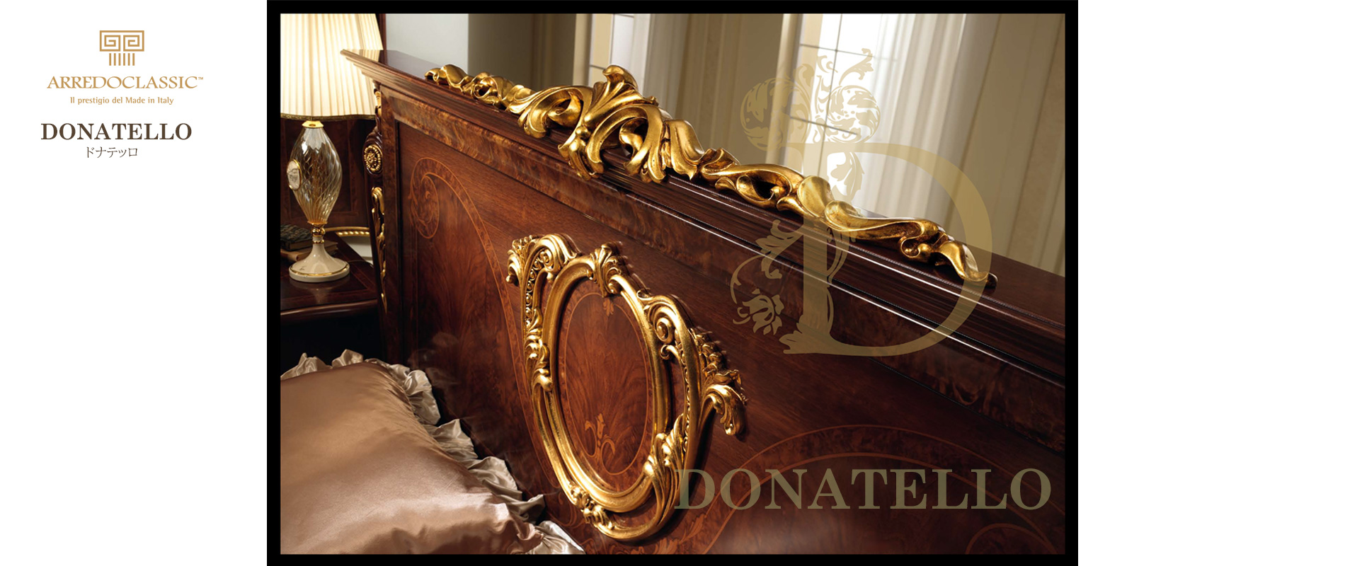 ドナテッロは、Arredoclassic が誇る至高のコレクションです。 ルネサンスの華麗な装飾様式を継承しつつ、各家具に施された精緻なフリーズや優美なディテールが、格調高いクラシックの美と洗練された現代性を優雅に調和させています。真のイタリアン・クラフツマンシップが息づくハンドメイド家具の贅を極めたコレクション。 住まいに上質な存在感と永く愛される美を求める方々のために、素材選びから仕上げに至るまで、細部に宿る職人の技と美意識を余すことなく注ぎ込んでデザインされています。