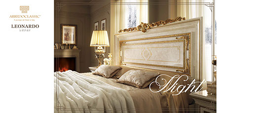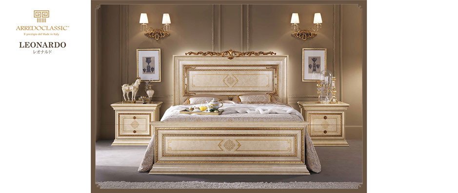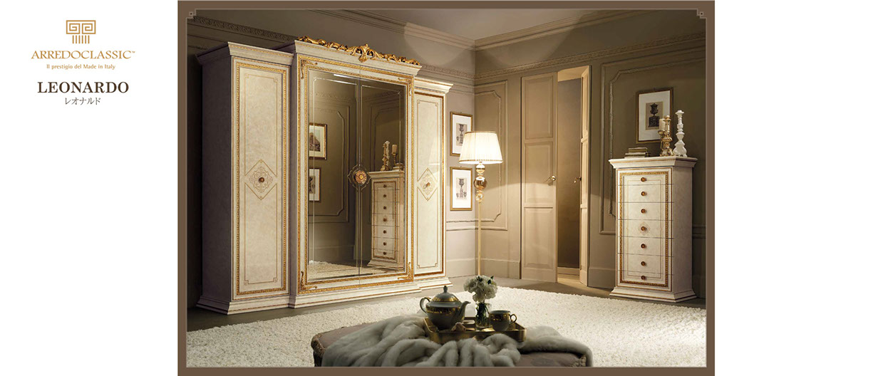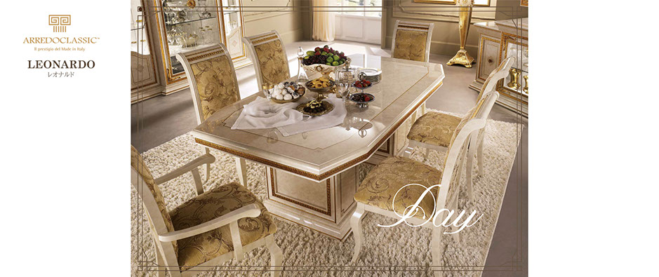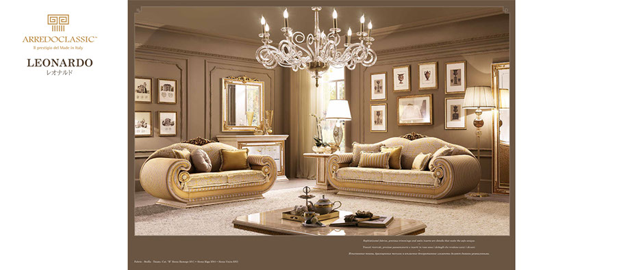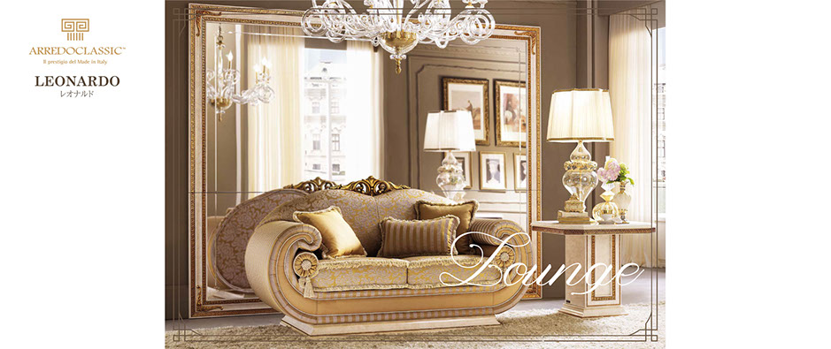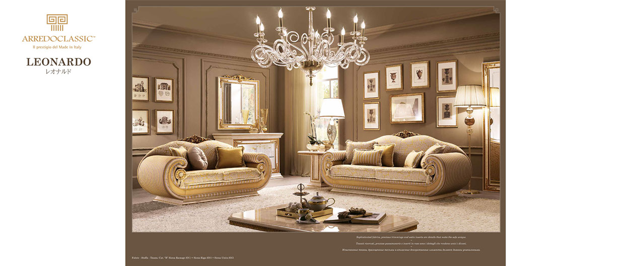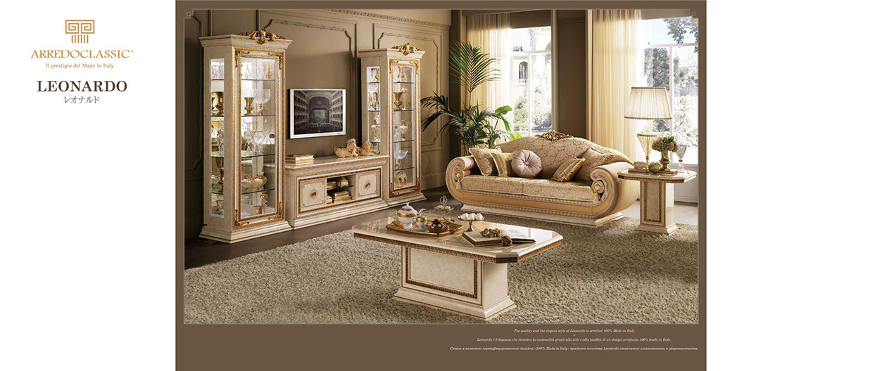 レオナルド・コレクションは、金箔の装飾や繊細な金箔の小花、そして優美な額縁を通じて、気品あるライフスタイルを語りかけるようにデザインされています。アレドクラシックの家具が置かれる空間には、この優雅さが静かに息づきます。コレクションの各アイテムは、大胆でありながら均整の取れたラインに独自のディテールが施され、それぞれが個性を放ちながらも、全体として調和のとれた美しい構成を生み出しています。リビングルームやパーラーなどの居住空間では、光沢を帯びた繊細な表面、ガラスの透明感、そしてきらめくゴールドのアクセントが、空間に明るさと洗練をもたらします。ベージュとゴールドのファブリックもまた魅力的です。ソファの優雅な曲線を包み込み、ゲストや居住者を柔らかく迎え入れます。座り心地は格別で、繊細に構築されたベース部分は、古代文明の意匠を思わせる趣を漂わせています。さらに、空間全体を完成へと導くために、芸術家具の高貴な伝統を想起させる金箔の装飾を加えることも可能です。細部に宿るその輝きが、空間に一層の格調を添えます。
