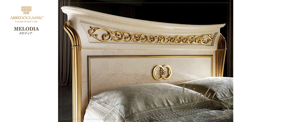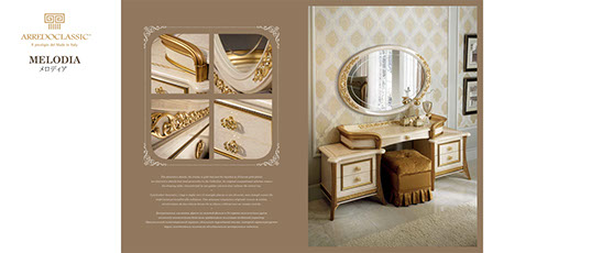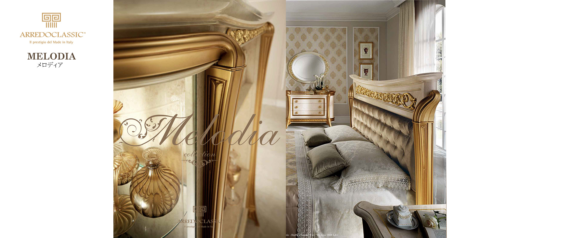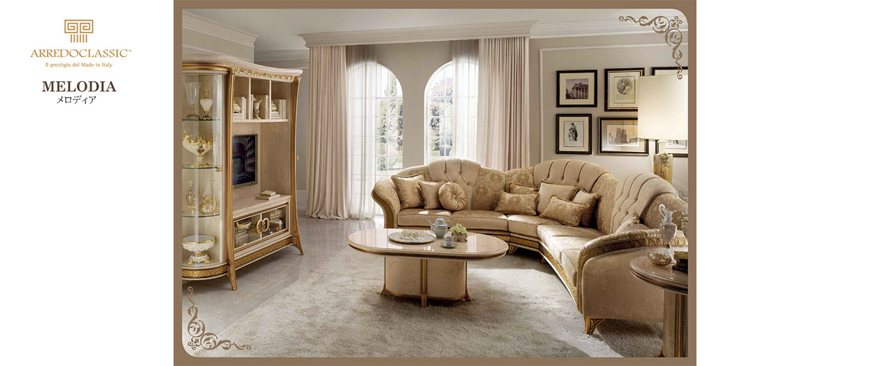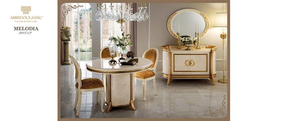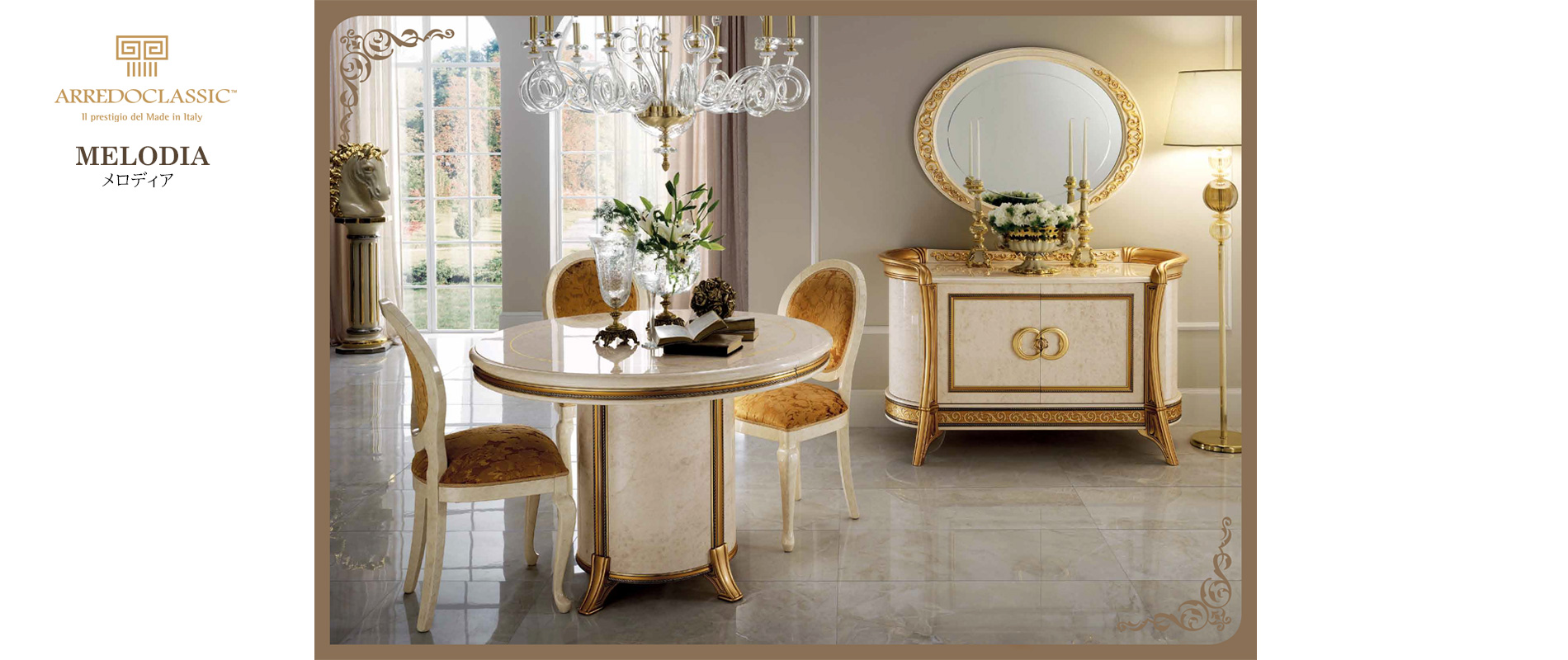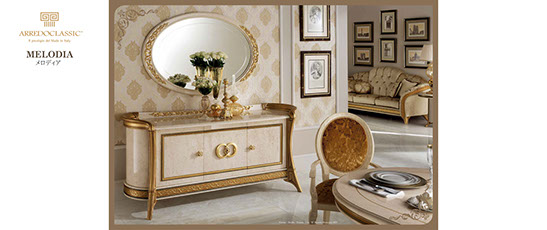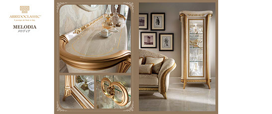 メロディアコレクションは、革新的な発想をもとに誕生したイタリア製家具シリーズです。クラシックなイタリアンスタイルに新たな息吹をもたらし、伝統とモダンが調和する独自の美を追求しています。柔らかくロマンティックな曲線美は、ネオクラシック様式の優雅な雰囲気を想起させます。アールデコのエッセンスが随所に散りばめられ、精緻なフリーズやアラベスク模様が家具のディテールを一層引き立てます。