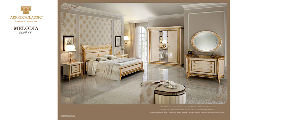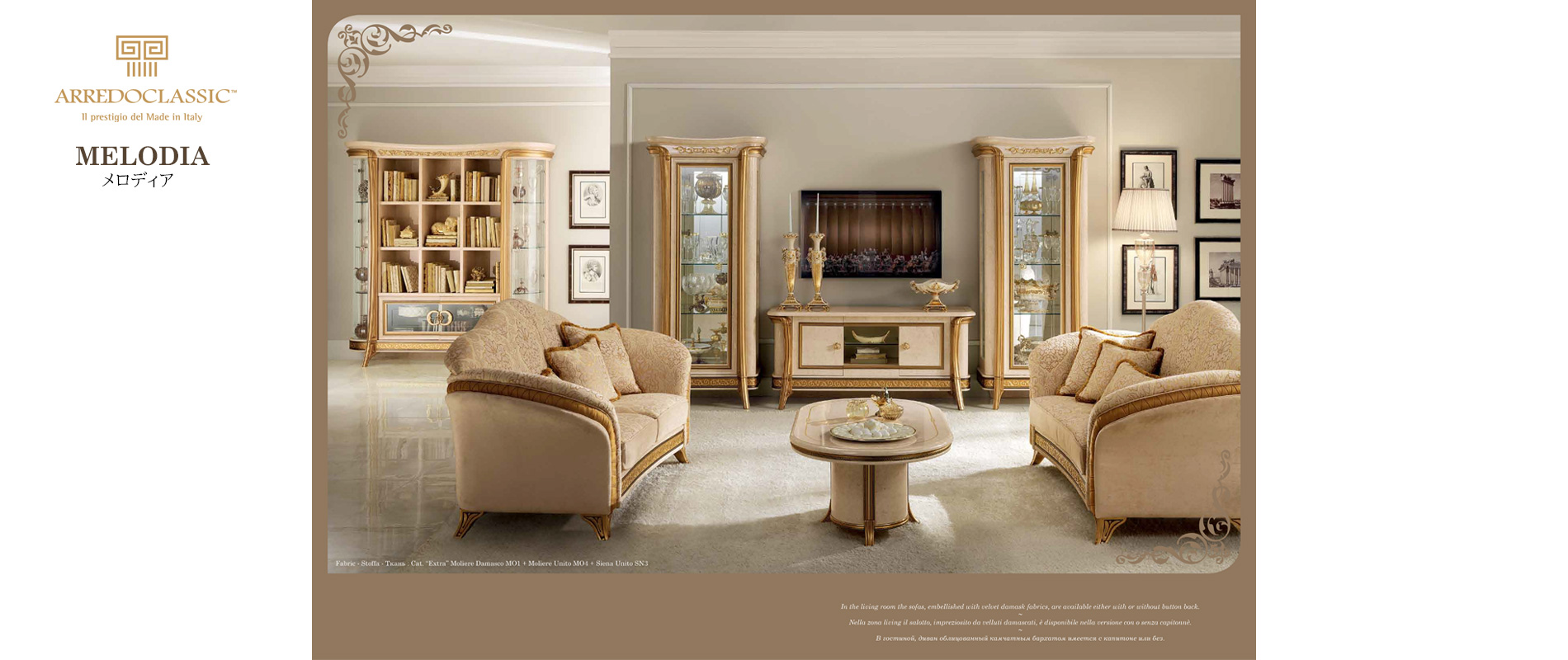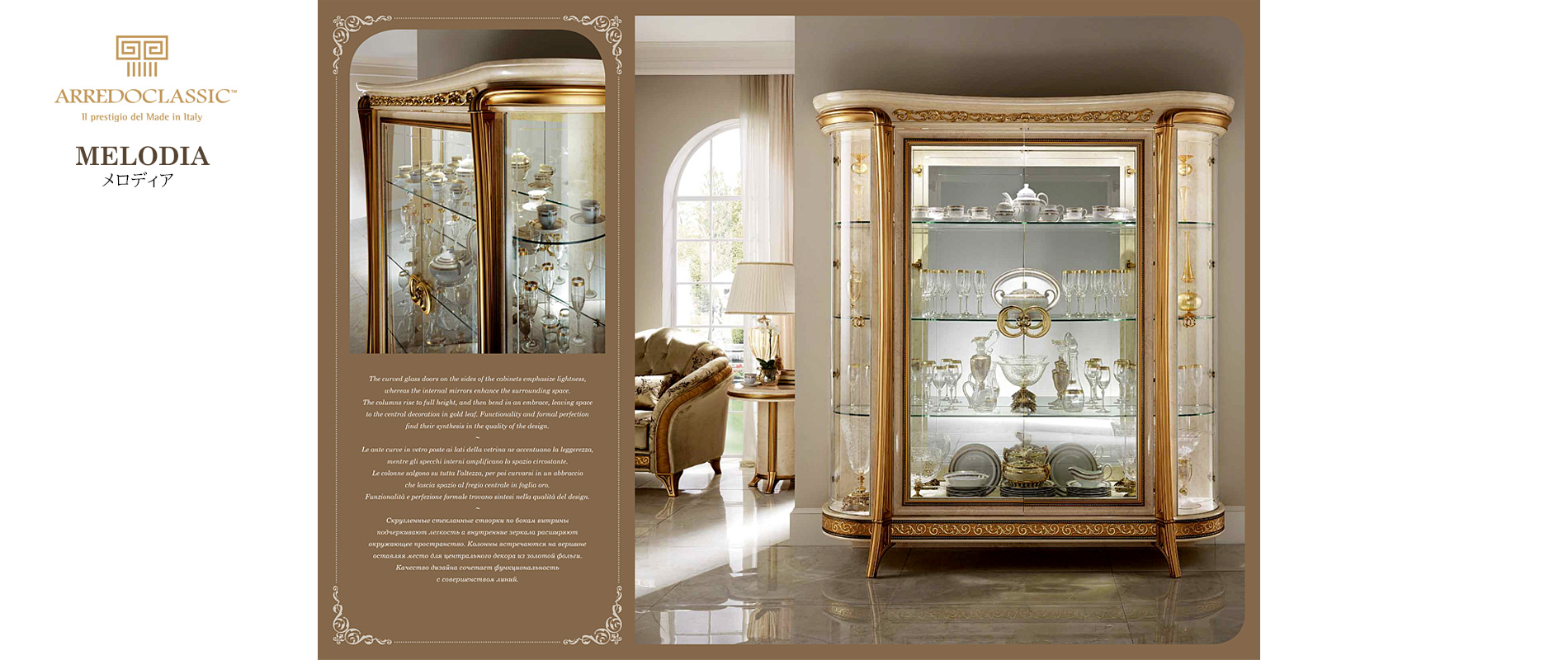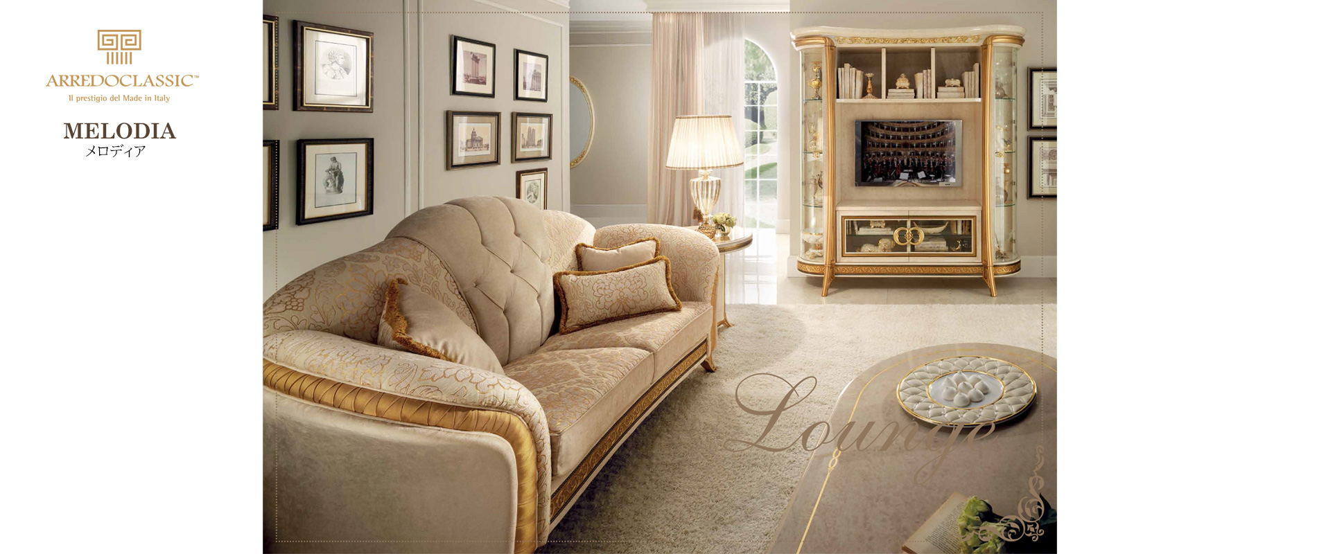 メロディアコレクションは、革新的な発想をもとに誕生したイタリア製家具シリーズです。クラシックなイタリアンスタイルに新たな息吹をもたらし、伝統とモダンが調和する独自の美を追求しています。柔らかくロマンティックな曲線美は、ネオクラシック様式の優雅な雰囲気を想起させます。アールデコのエッセンスが随所に散りばめられ、精緻なフリーズやアラベスク模様が家具のディテールを一層引き立てます。
