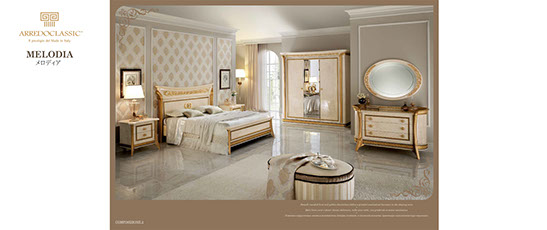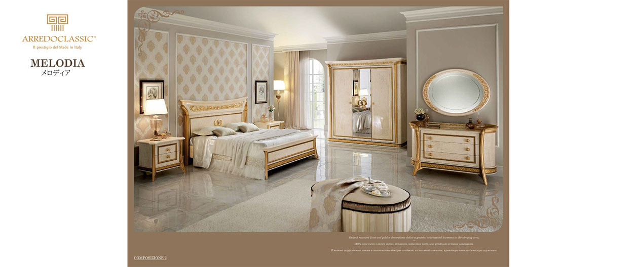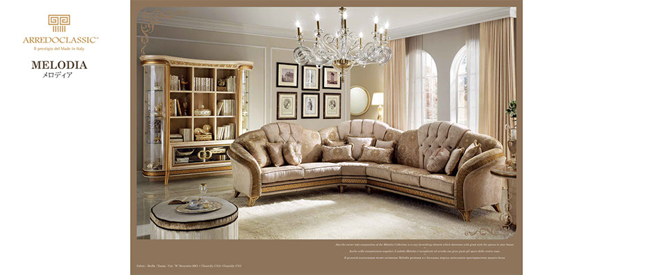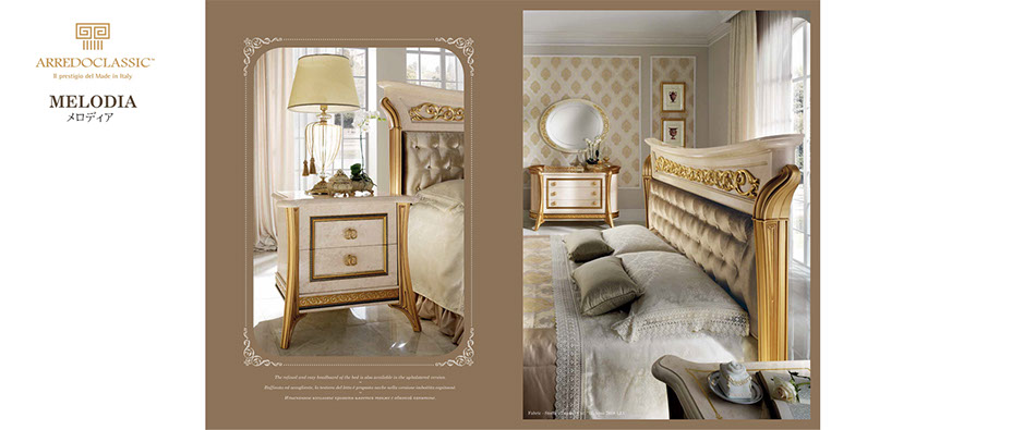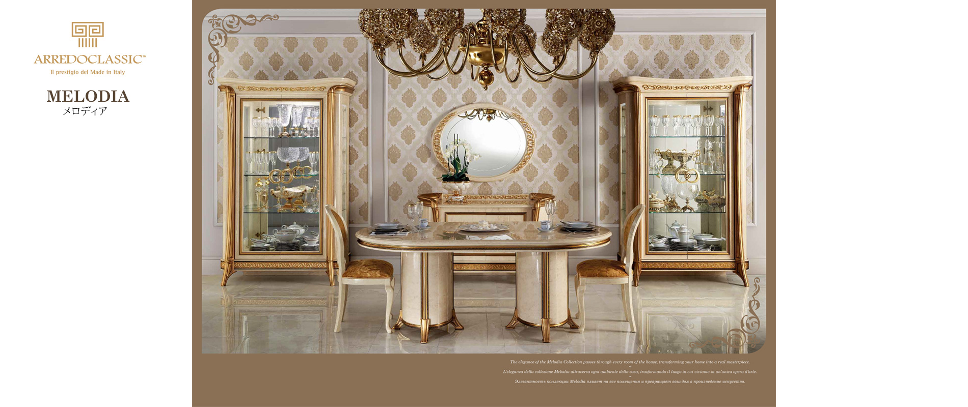 Melodiaコレクションは、Arredoclassicが追求してきた革新性を見事に体現したシリーズです。デザイナーたちは外部からの新しいインスピレーションを柔軟に取り入れつつ、イタリアンクラシックスタイルを支えてきた伝統への深い敬意を忘れることなく、その美意識を損なわずに進化させる卓越した感性を発揮しています。このコレクションは、アールデコ調の金箔フリーズやアラベスク模様、優雅に流れるライン、そして大胆なボリューム感を特徴とし、ネオクラシックスタイルを現代的に再解釈した作品です。Melodiaの家具で彩られた空間は、調和と洗練が息づき、心地よさとくつろぎ、そして日常に寄り添う機能性を兼ね備えた上質な住まいへと導きます。