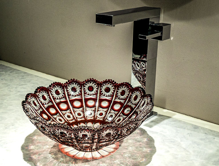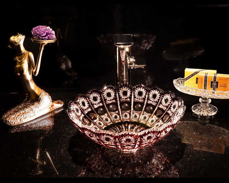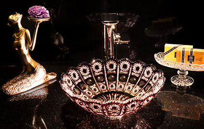 19世紀半ばに、ガラス職人クラリクによって様々な色のアラバスターガラスが発明されました。有色ガラスを利用した技法の一つには、ガラスの生地に有色ガラスを重ね、カットやグラヴィール彫刻を施していく「被せガラス」があります。こちらのRUBINはその装飾技法を用いた伝統の産物。19世紀には輸出用の登録商標として「ボヘミア・クリスタル」という名称が考案され、ガラス芸術品としてブランド・イメージの向上に大きな役割を果たしました.