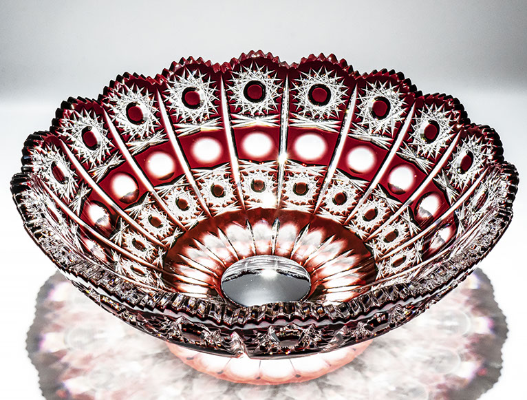 QUEEN(クイーン)は、ドレスの裾のように花びら型にエッジをカットした、可憐で華やかなデザイン。RUBIN(ルビン)はその中でも最もエレガントな魅力を放つ、スペシャルプロダクトです。ワインレッドに近い上質な赤色のルビーレッドを、伝統の被せ(きせ)ガラスの技法を用いてクリスタルのボウルにし、さらにクリスタルガラス本来の美しい輝きとエッジにまでこだわった超繊細なカッティングを施しました。 ボヘミアガラス芸術史上、永遠のベストセラーカットである500pk(Elizabethエリザベス)を更に可憐にデコレーションした、究極のモデルです。 こだわりの色彩と、華やかなデザイン、伝統に裏打ちされたカッティング技巧をご堪能下さい。