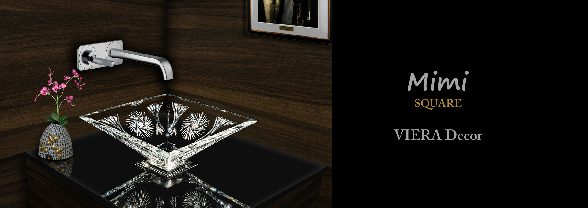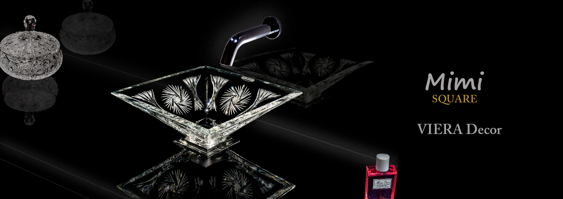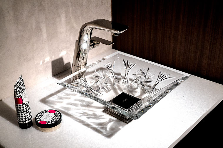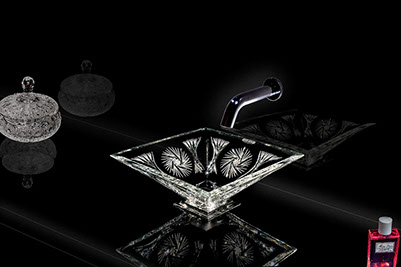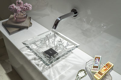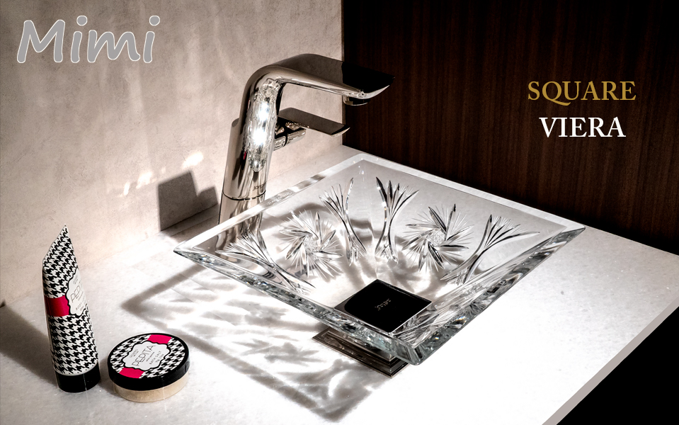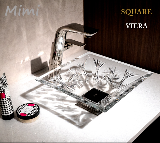 ヴィエラはスクエアーシリーズの中でもシンプルなカッティング(ガラス彫刻)で非常に透明感のある美しいクリスタル手洗い器です。伝統的なカッティングは風車をモチーフにデザインされており、クリスタルの持つ美しい透明感、ひとつひとつのカッティングがどの角度から見ても色々なクリスタル独特の輝きが美しい洗面スペースを華やかに演出いたします。
