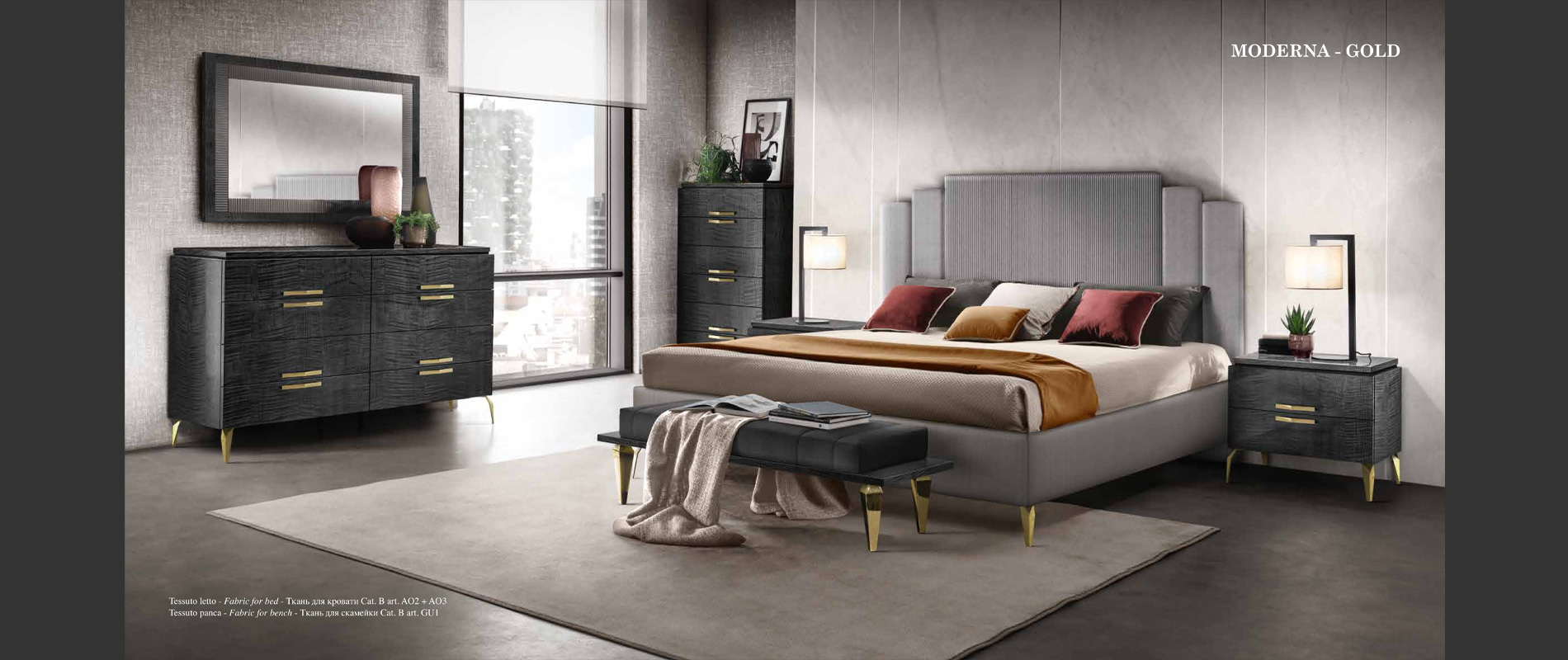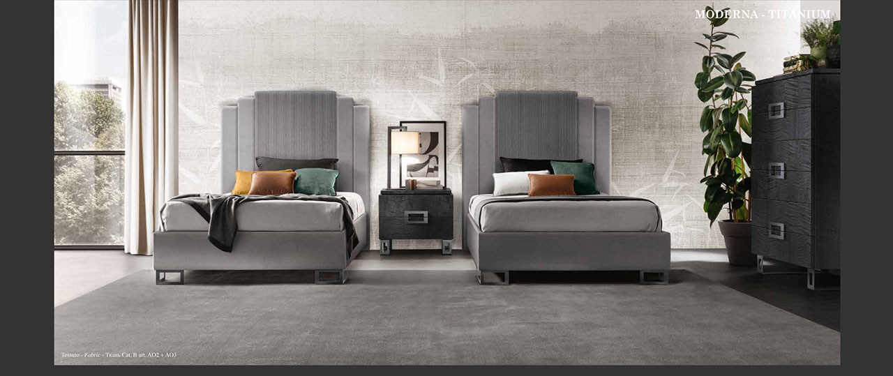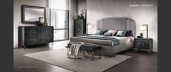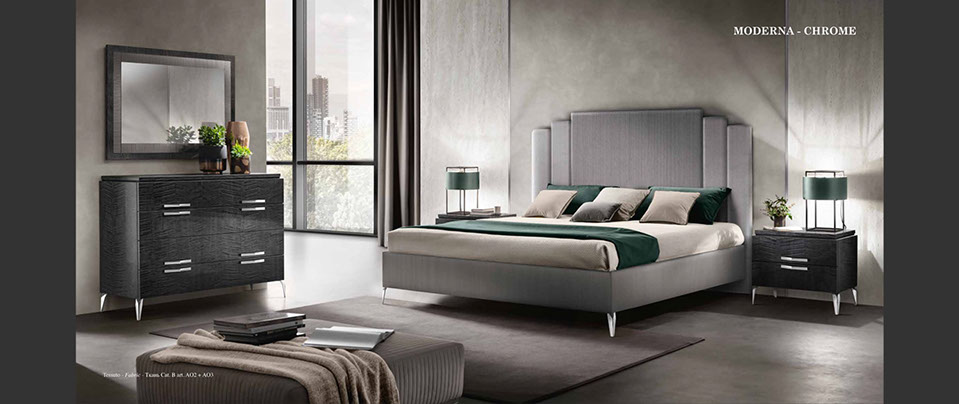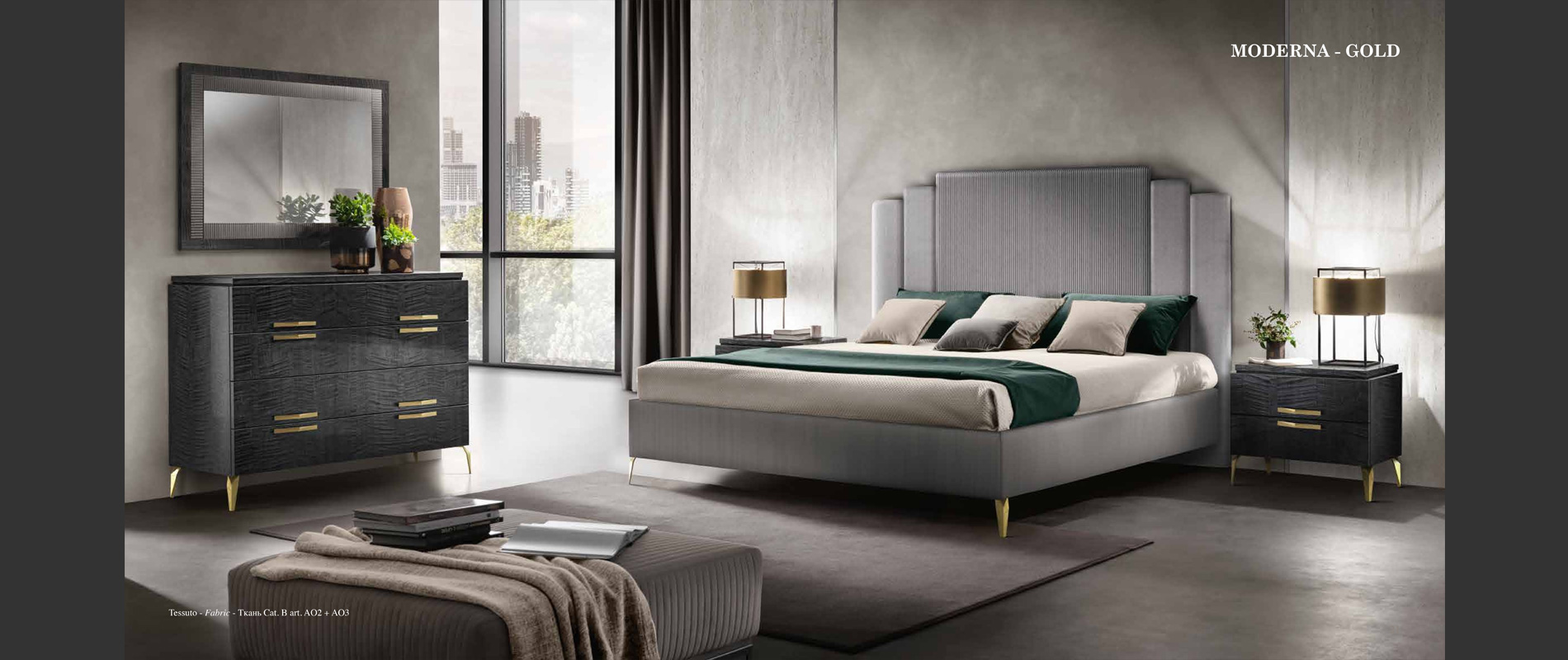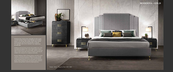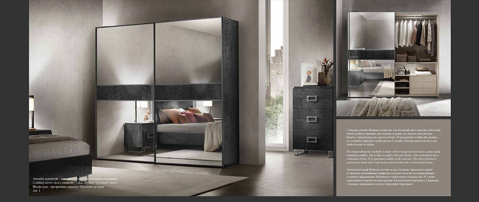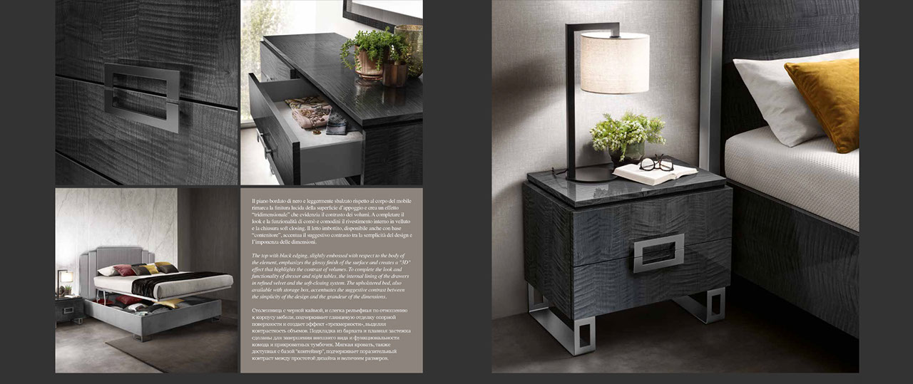 アドラの「モデルナ」コレクションが彩る寝室は、現代の荒々しさと、イタリアンデザインが持つ静かな気品が溶け合う舞台です。直線的で研ぎ澄まされた家具のラインは、空間に凛としたリズムを刻み、その上に重ねられた繊細な仕上げやエレガントなディテールが、ミニマルでありながら豊かな表情をもつ“静寂の美”を生み出します。すべての家具には、スモーキーグレーの光沢ラッカーをまとったシカモア材が使われ、柔らかな光を受けて、まるで霧の中から姿を現すように静かに輝きます。さらに、脚やハンドルなどのアクセサリーは、3つのスタイルとカラーバリエーションから選べるカスタマイズ性を備え、空間にあなた自身の美意識をそっと映し込むことができます