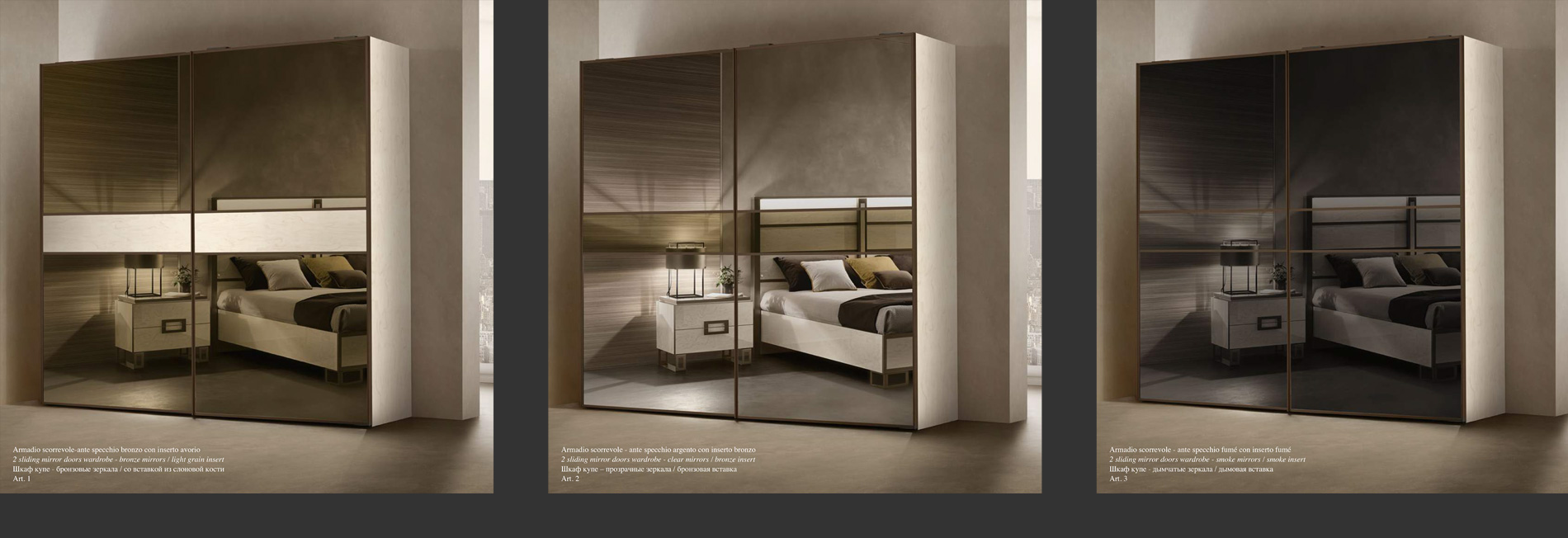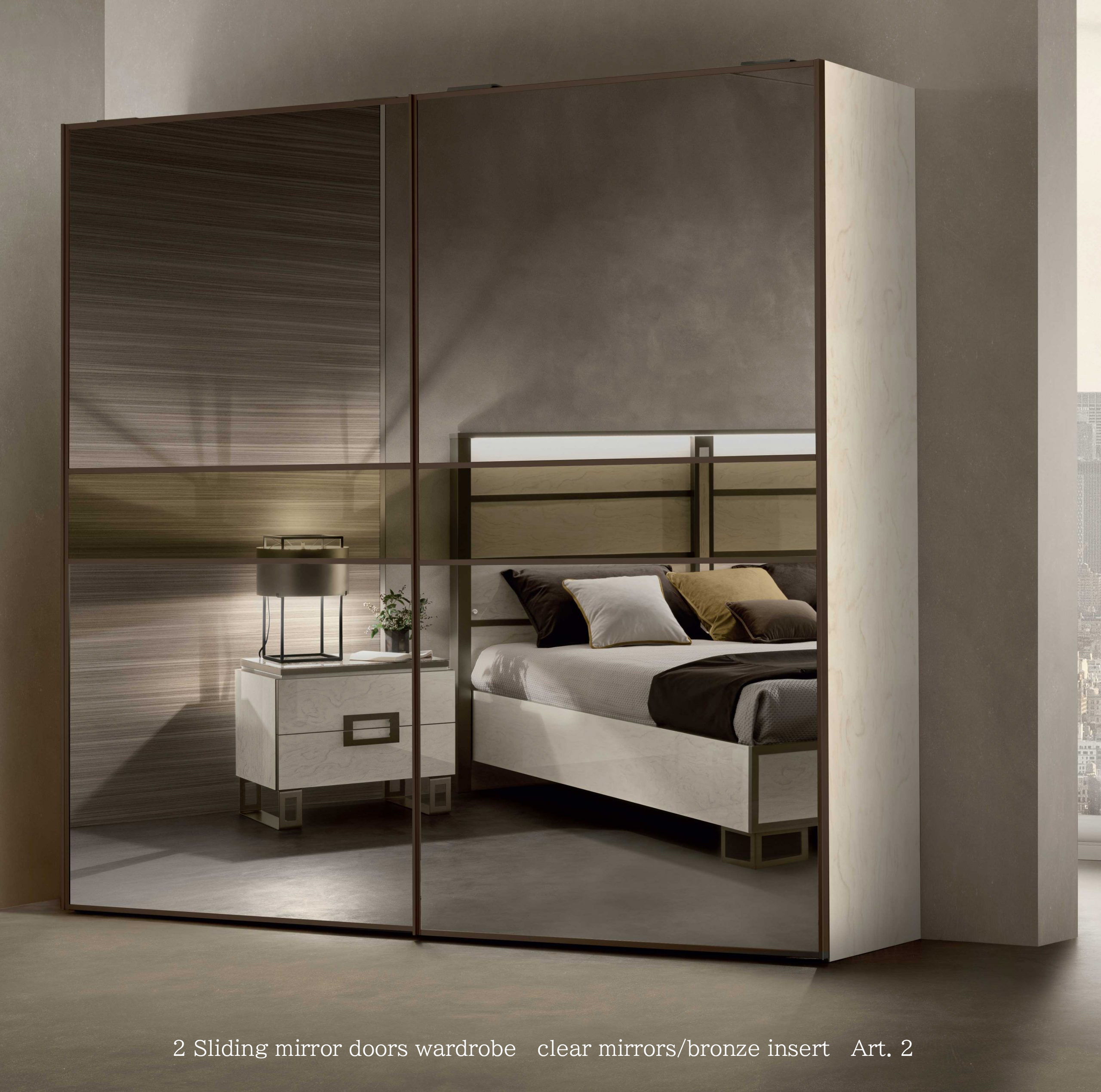 エレガントなPoesia(ポエジア)ワードローブは、頑丈なアルミプロファイルを使用した2つの大きな鏡面扉を備え、ソフトクロージング機能付きのガイドに沿ってスライドします。側面と棚板は35mmの厚みがあり、構造の堅牢性を確保しています。チェスト(オプション)は、ソフトクロージング機能付きの引き出しが3つあり、底部はベルベットの裏地付きです。スライディング ドアのミラーカラー表面処理材のカラーモードも変更可能です。壁面への埋め込みなども可能でおしゃれに美しく演出いたします。
