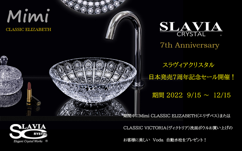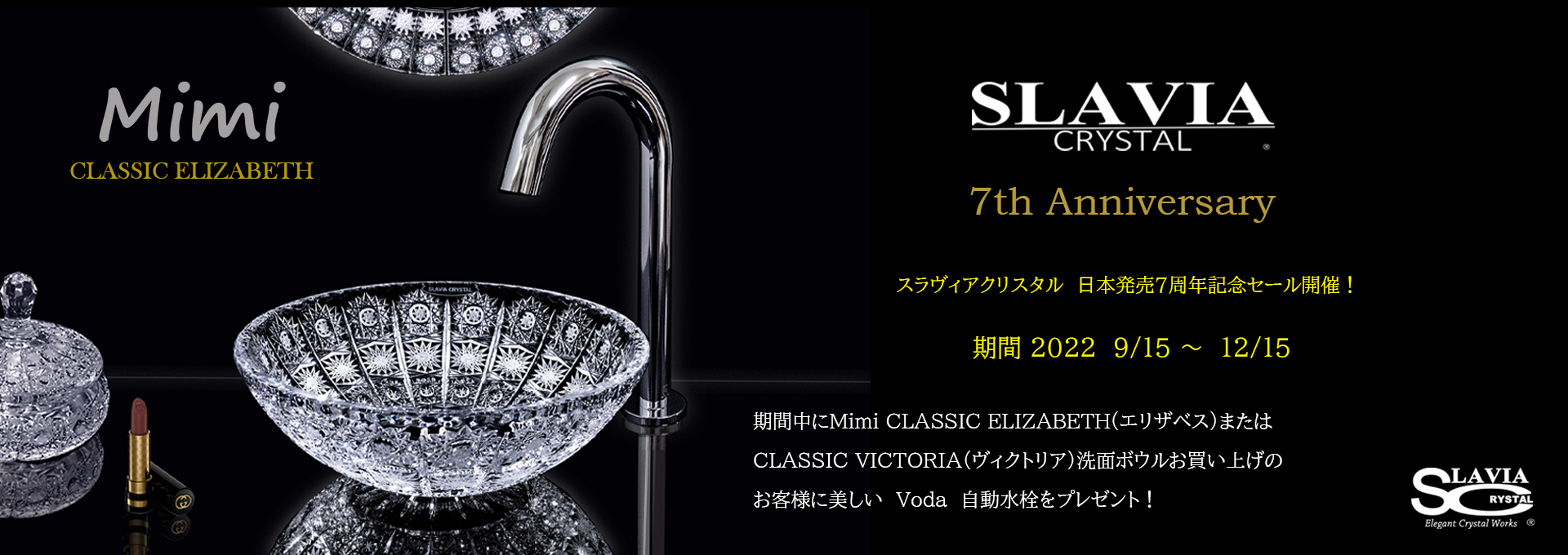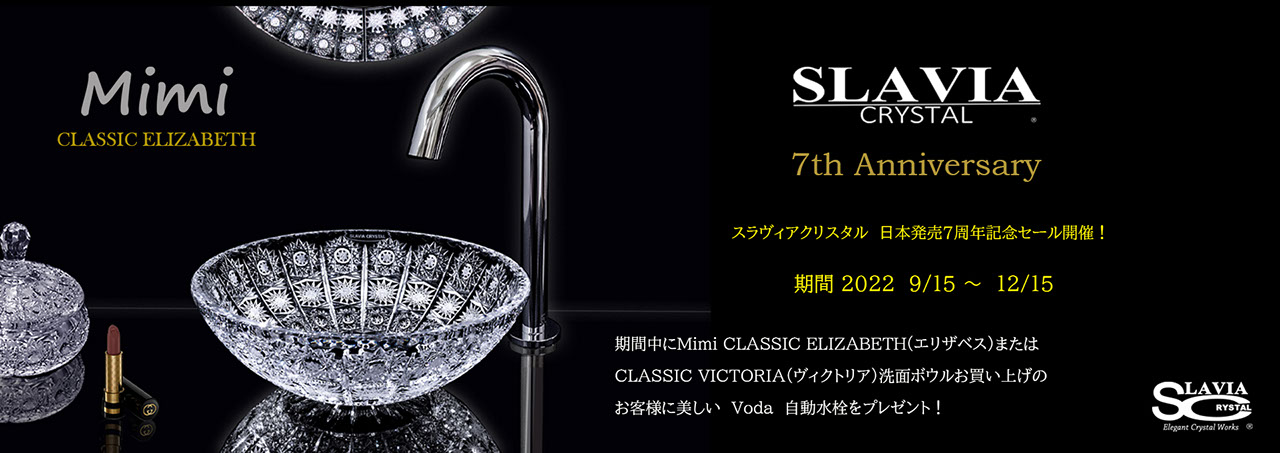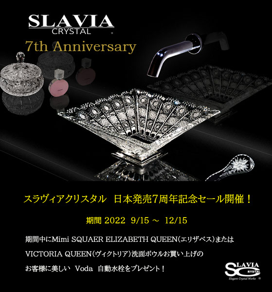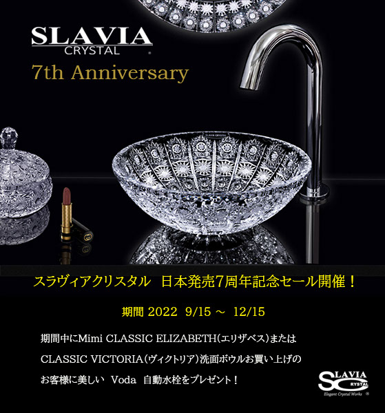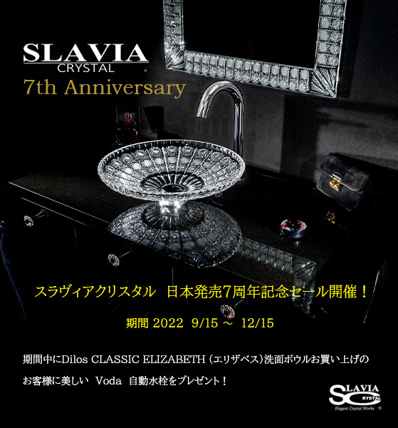 SLAVIA CRYSTAL スラヴィアクリスタル 日本販売 7周年を迎え、平素よりご愛顧にあずかり誠にありがとうございます。 日本発売から多くのお客様にご愛顧頂き、早くも7年を迎えることができましたのも皆様のご愛顧とご支援によるものと深く感謝しております。日頃のご愛顧に感謝いたしまして、7周年記念セールを開催いたします。期間中に下記製品をお買い上げのお客様に、弊社オリジナル、「VODA] ヴォーダ自動水栓をもれなくプレゼントいたします。 セール詳細は下記をご覧くださいませ。今後ともいっそうのご愛顧を賜りますようよろしくお願い申し上げます。