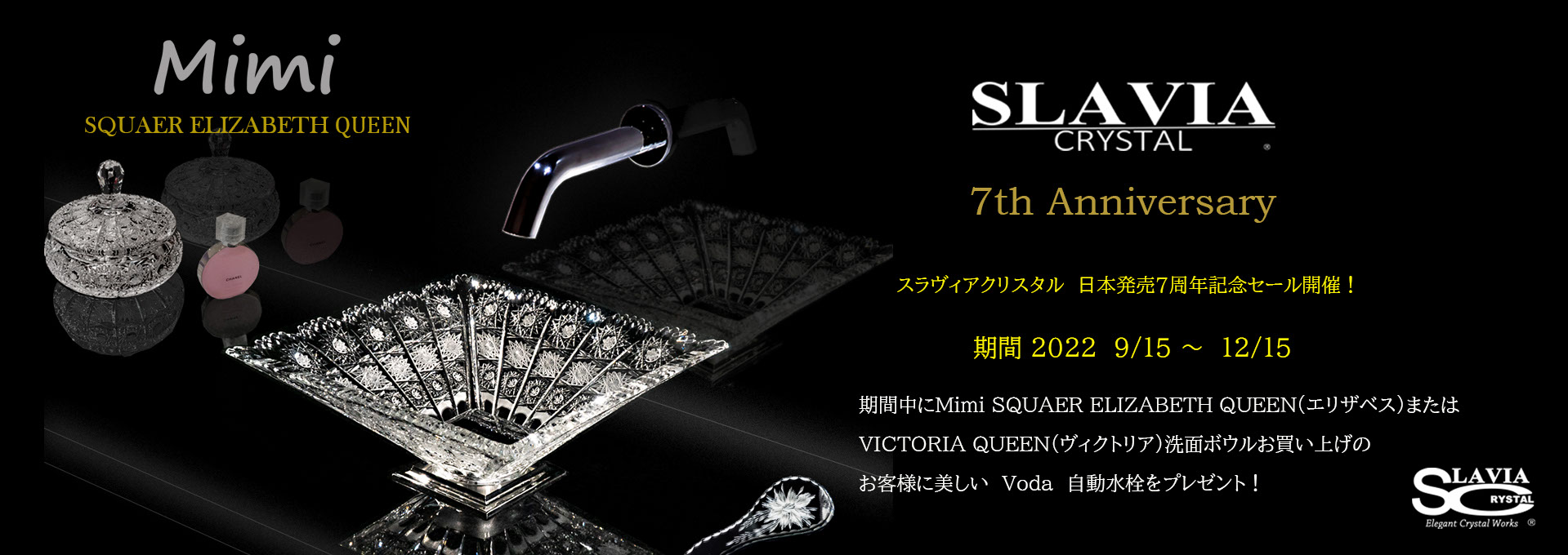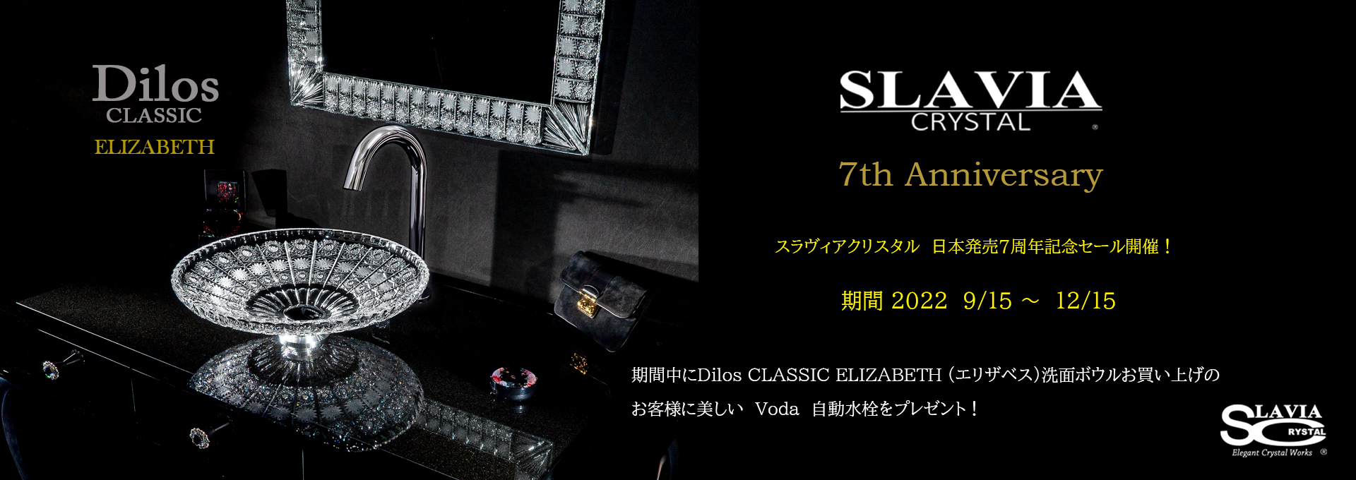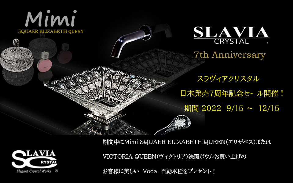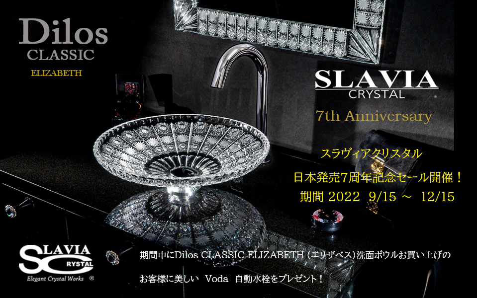 SLAVIA CRYSTAL スラヴィアクリスタル 日本販売 7周年を迎え、平素よりご愛顧にあずかり誠にありがとうございます。 日本発売から多くのお客様にご愛顧頂き、早くも7年を迎えることができましたのも皆様のご愛顧とご支援によるものと深く感謝しております。日頃のご愛顧に感謝いたしまして、7周年記念セールを開催いたします。期間中に下記製品をお買い上げのお客様に、弊社オリジナル、「VODA] ヴォーダ自動水栓をもれなくプレゼントいたします。 セール詳細は下記をご覧くださいませ。今後ともいっそうのご愛顧を賜りますようよろしくお願い申し上げます。