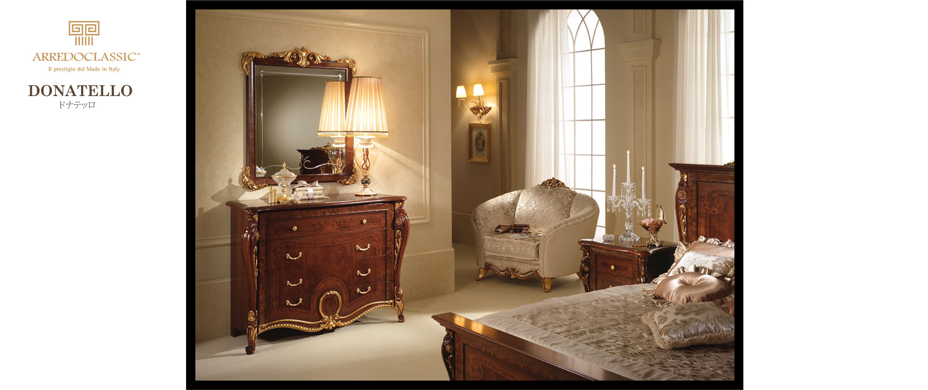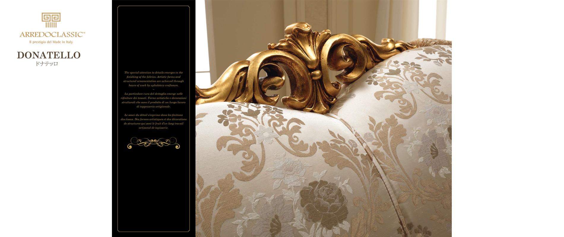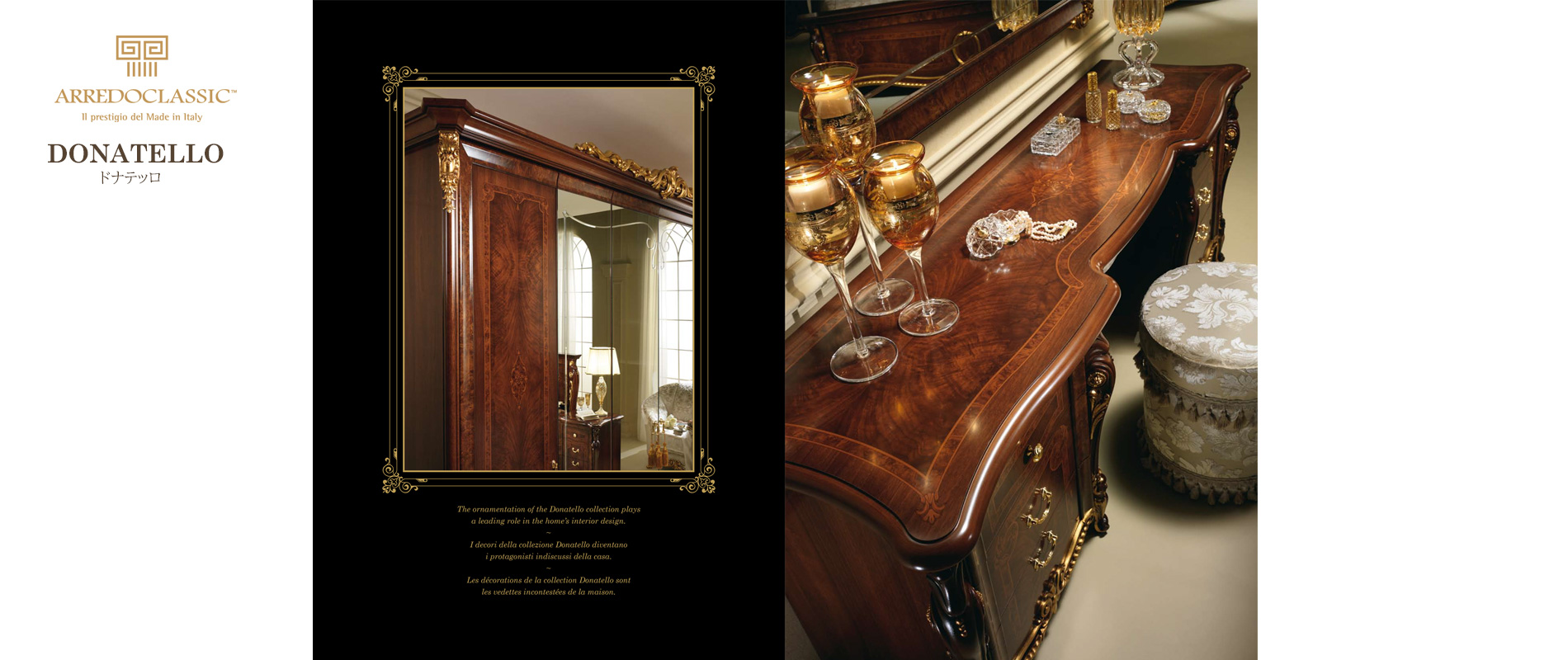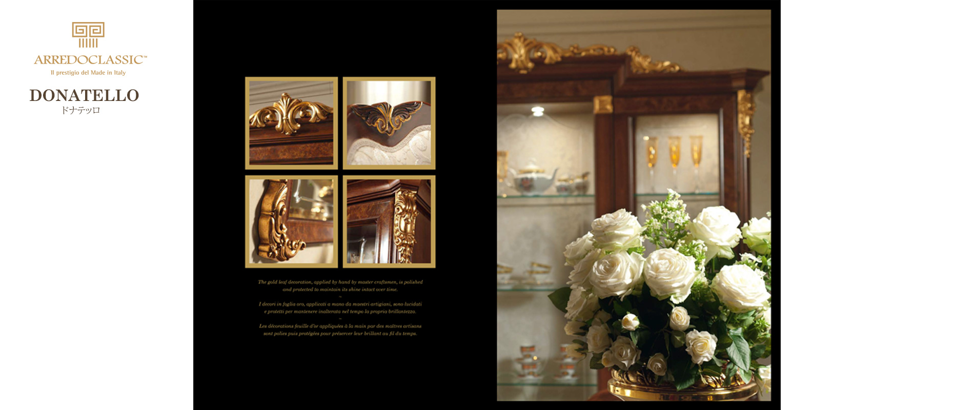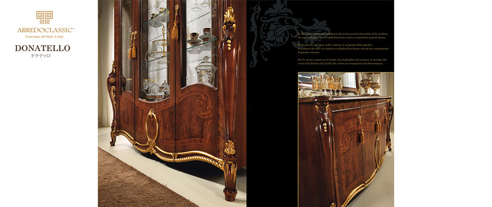 ドナテッロは、Arredoclassic が誇る至高のコレクションです。 ルネサンスの華麗な装飾様式を継承しつつ、各家具に施された精緻なフリーズや優美なディテールが、格調高いクラシックの美と洗練された現代性を優雅に調和させています。真のイタリアン・クラフツマンシップが息づくハンドメイド家具の贅を極めたコレクション。 住まいに上質な存在感と永く愛される美を求める方々のために、素材選びから仕上げに至るまで、細部に宿る職人の技と美意識を余すことなく注ぎ込んでデザインされています。