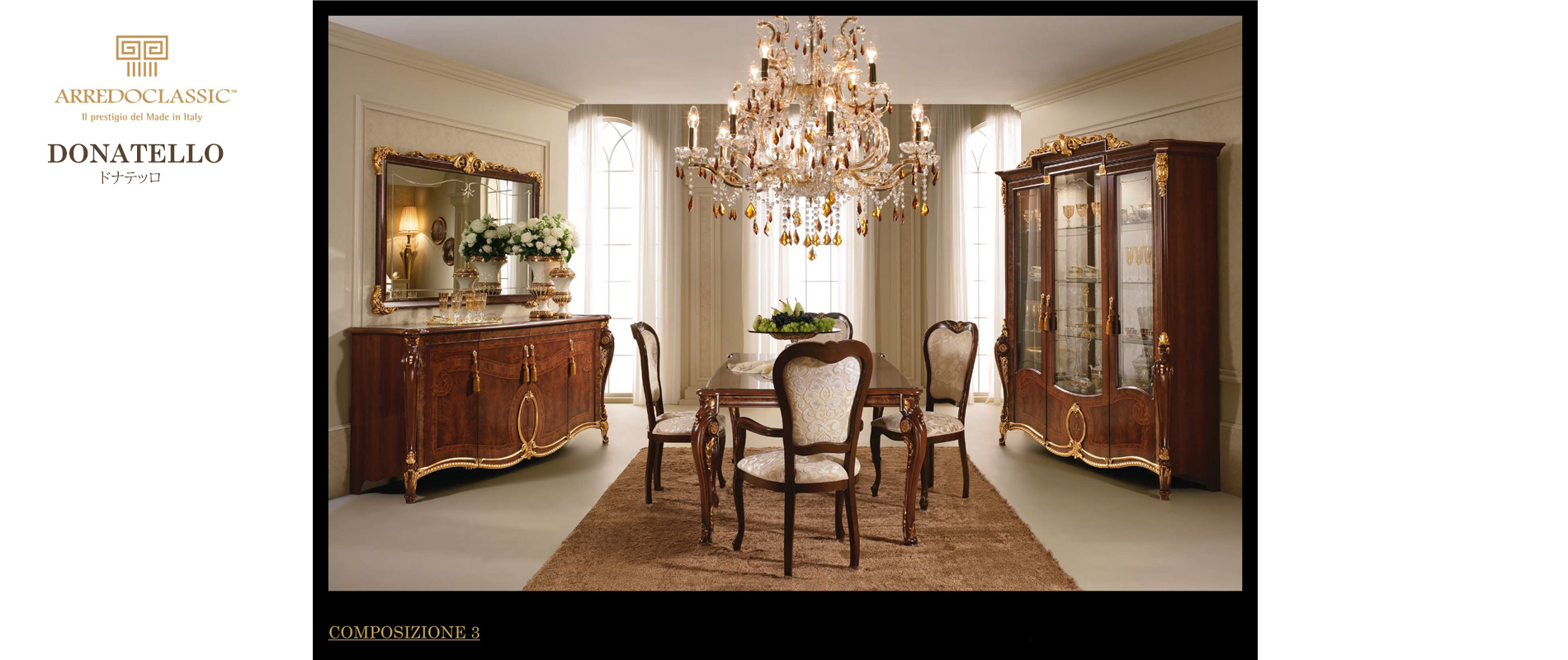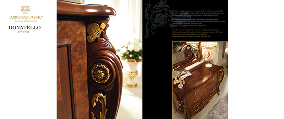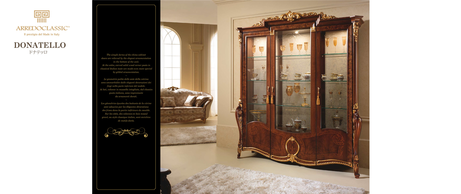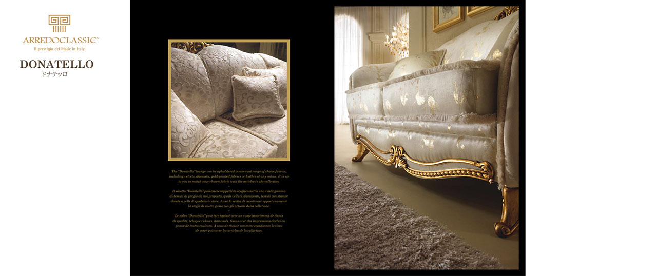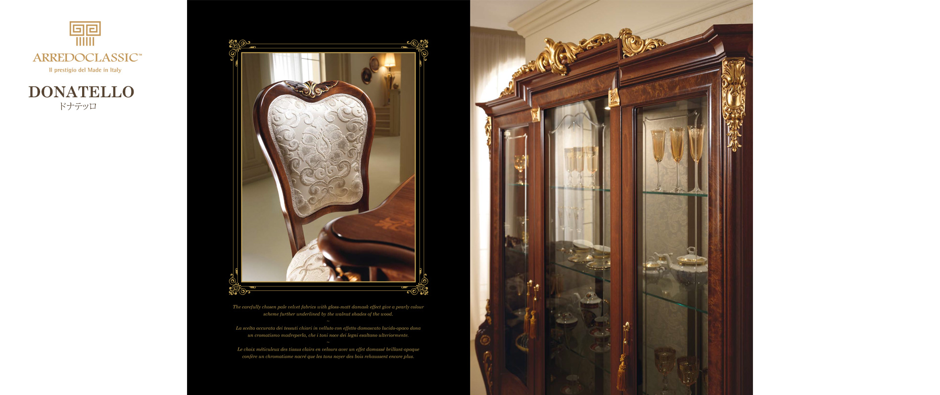 ドナテッロは、Arredoclassic が誇る至高のコレクションです。 ルネサンスの華麗な装飾様式を継承しつつ、各家具に施された精緻なフリーズや優美なディテールが、格調高いクラシックの美と洗練された現代性を優雅に調和させています。真のイタリアン・クラフツマンシップが息づくハンドメイド家具の贅を極めたコレクション。 住まいに上質な存在感と永く愛される美を求める方々のために、素材選びから仕上げに至るまで、細部に宿る職人の技と美意識を余すことなく注ぎ込んでデザインされています。