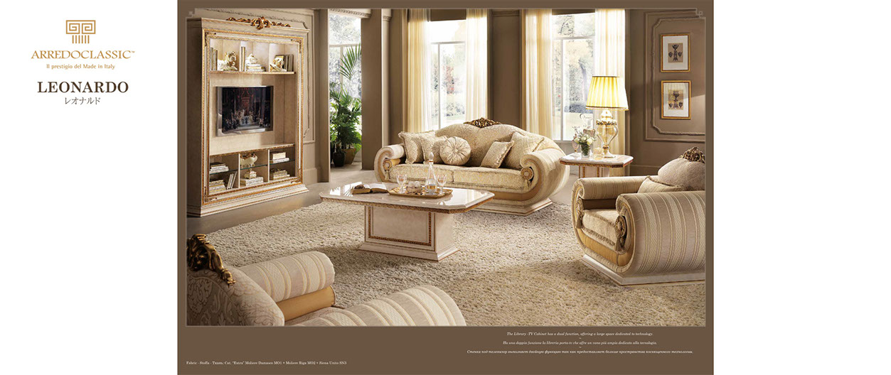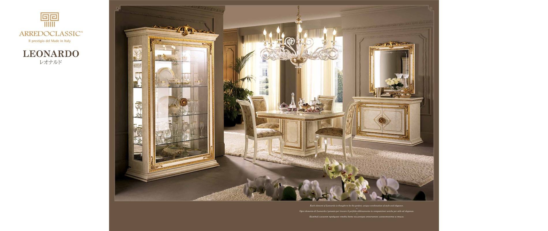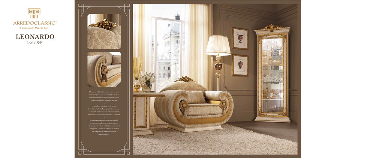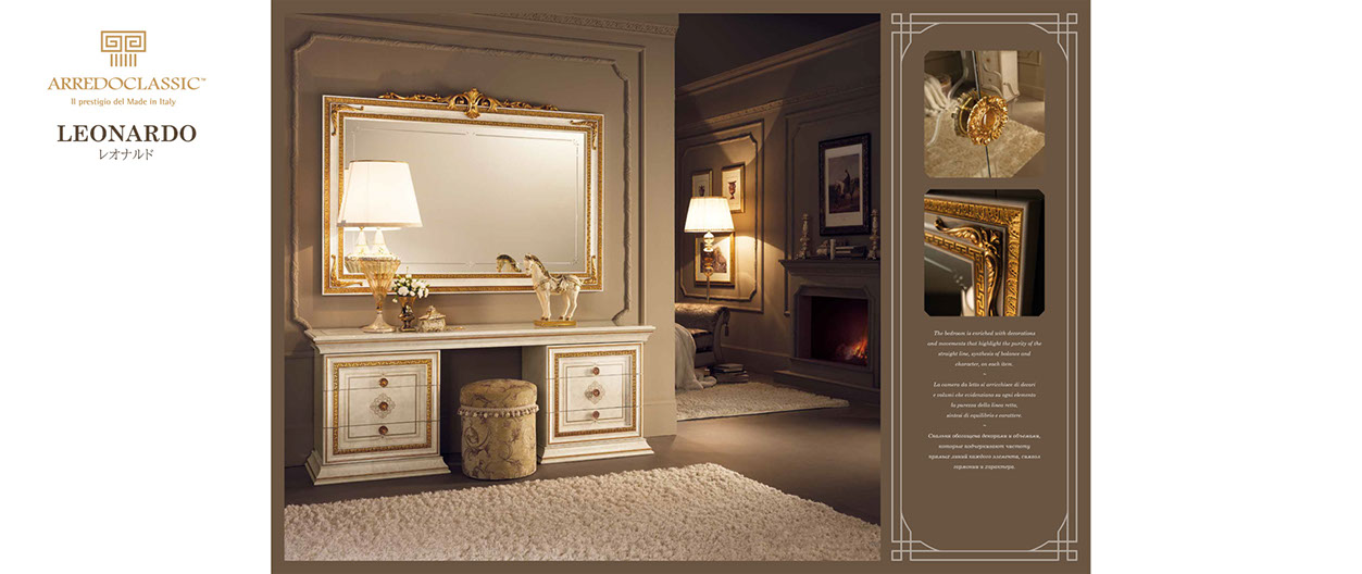 レオナルド・コレクションは、金箔の装飾や繊細な金箔の小花、そして優美な額縁を通じて、気品あるライフスタイルを語りかけるようにデザインされています。アレドクラシックの家具が置かれる空間には、この優雅さが静かに息づきます。コレクションの各アイテムは、大胆でありながら均整の取れたラインに独自のディテールが施され、それぞれが個性を放ちながらも、全体として調和のとれた美しい構成を生み出しています。リビングルームやパーラーなどの居住空間では、光沢を帯びた繊細な表面、ガラスの透明感、そしてきらめくゴールドのアクセントが、空間に明るさと洗練をもたらします。ベージュとゴールドのファブリックもまた魅力的です。ソファの優雅な曲線を包み込み、ゲストや居住者を柔らかく迎え入れます。座り心地は格別で、繊細に構築されたベース部分は、古代文明の意匠を思わせる趣を漂わせています。さらに、空間全体を完成へと導くために、芸術家具の高貴な伝統を想起させる金箔の装飾を加えることも可能です。細部に宿るその輝きが、空間に一層の格調を添えます。