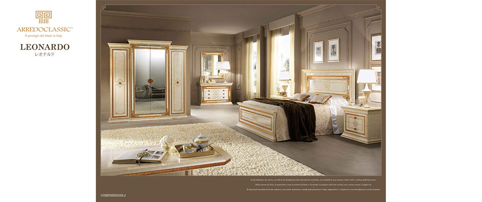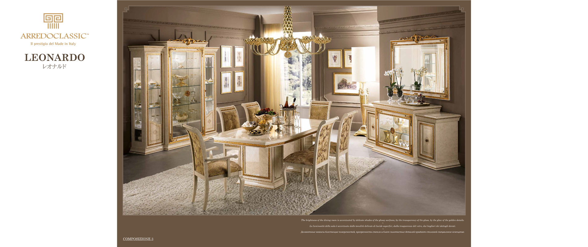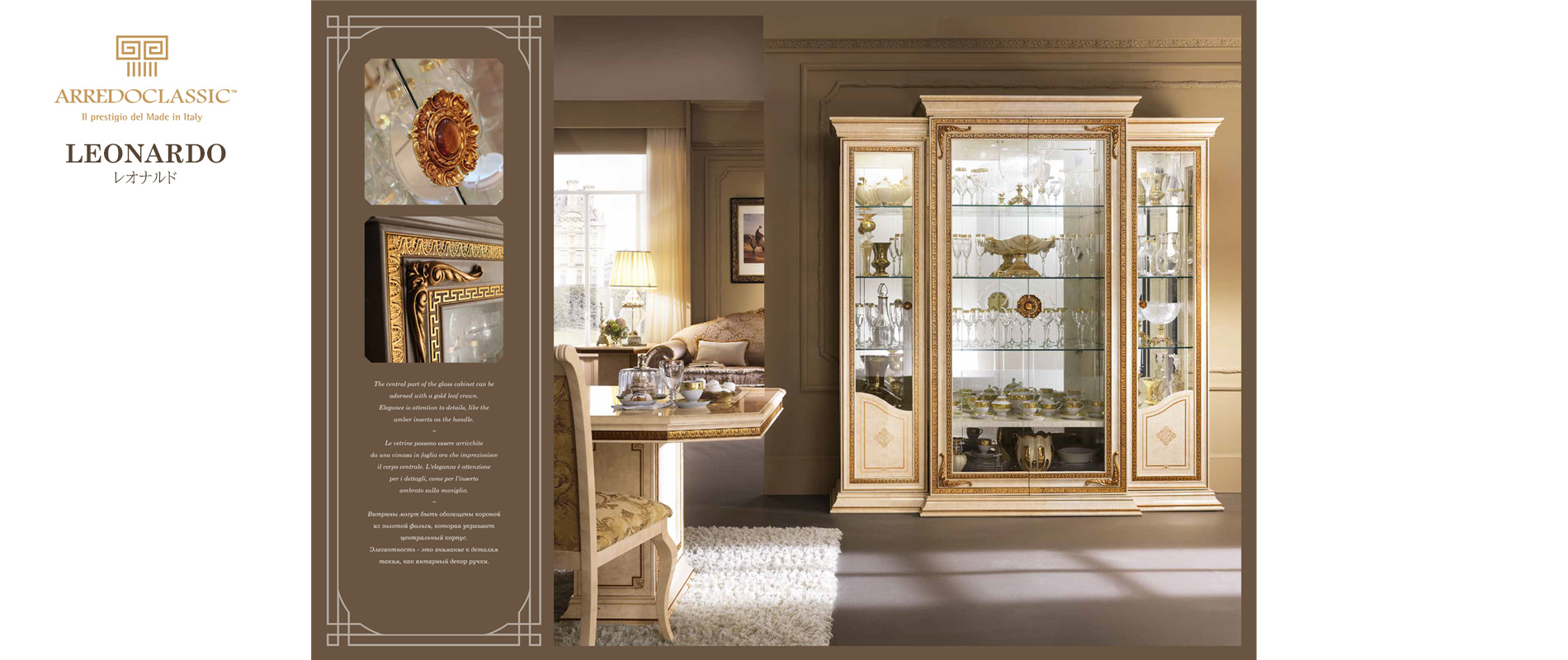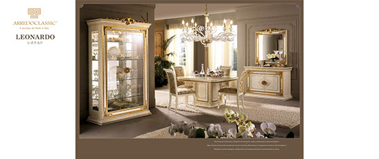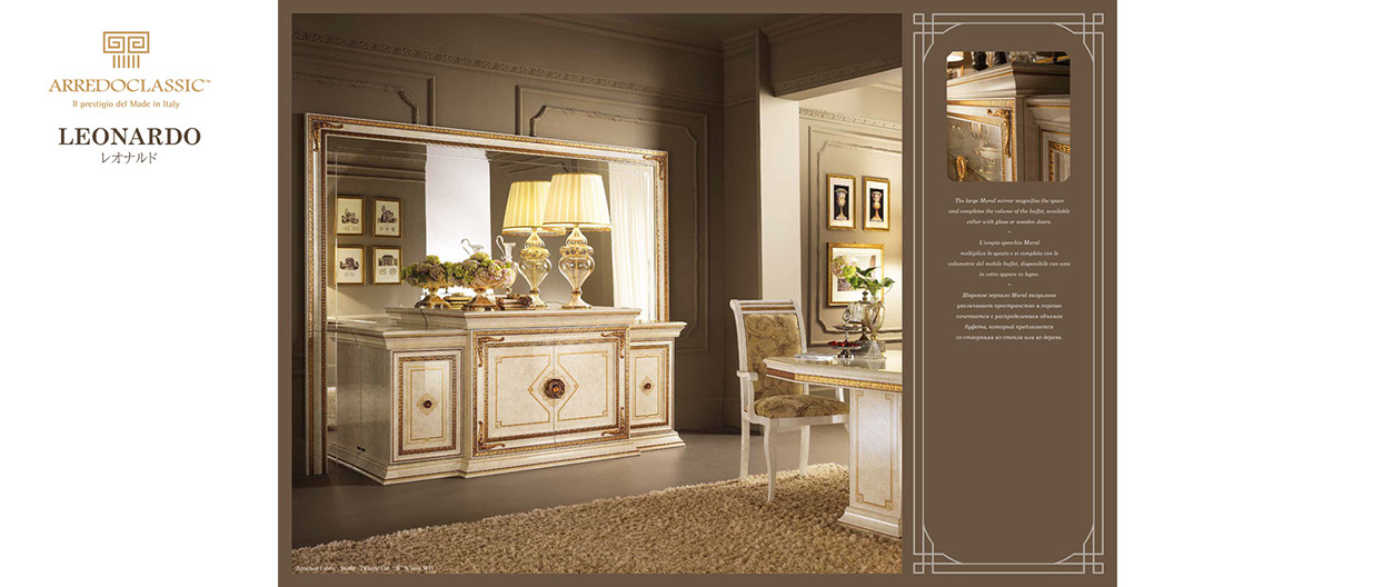 レオナルド・コレクションは、金箔の装飾や繊細な金箔の小花、そして優美な額縁を通じて、気品あるライフスタイルを語りかけるようにデザインされています。アレドクラシックの家具が置かれる空間には、この優雅さが静かに息づきます。コレクションの各アイテムは、大胆でありながら均整の取れたラインに独自のディテールが施され、それぞれが個性を放ちながらも、全体として調和のとれた美しい構成を生み出しています。リビングルームやパーラーなどの居住空間では、光沢を帯びた繊細な表面、ガラスの透明感、そしてきらめくゴールドのアクセントが、空間に明るさと洗練をもたらします。ベージュとゴールドのファブリックもまた魅力的です。ソファの優雅な曲線を包み込み、ゲストや居住者を柔らかく迎え入れます。座り心地は格別で、繊細に構築されたベース部分は、古代文明の意匠を思わせる趣を漂わせています。さらに、空間全体を完成へと導くために、芸術家具の高貴な伝統を想起させる金箔の装飾を加えることも可能です。細部に宿るその輝きが、空間に一層の格調を添えます。