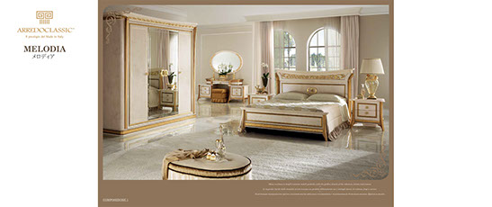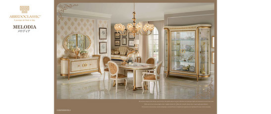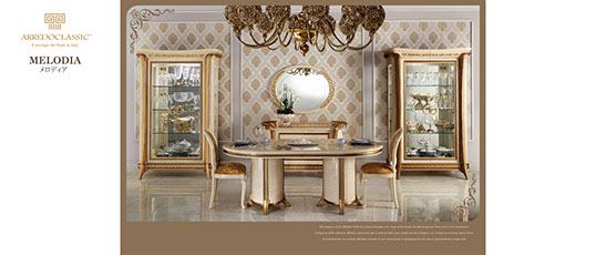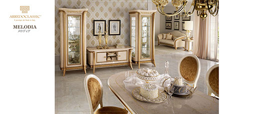 Melodiaコレクションは、Arredoclassicが追求してきた革新性を見事に体現したシリーズです。デザイナーたちは外部からの新しいインスピレーションを柔軟に取り入れつつ、イタリアンクラシックスタイルを支えてきた伝統への深い敬意を忘れることなく、その美意識を損なわずに進化させる卓越した感性を発揮しています。このコレクションは、アールデコ調の金箔フリーズやアラベスク模様、優雅に流れるライン、そして大胆なボリューム感を特徴とし、ネオクラシックスタイルを現代的に再解釈した作品です。Melodiaの家具で彩られた空間は、調和と洗練が息づき、心地よさとくつろぎ、そして日常に寄り添う機能性を兼ね備えた上質な住まいへと導きます。