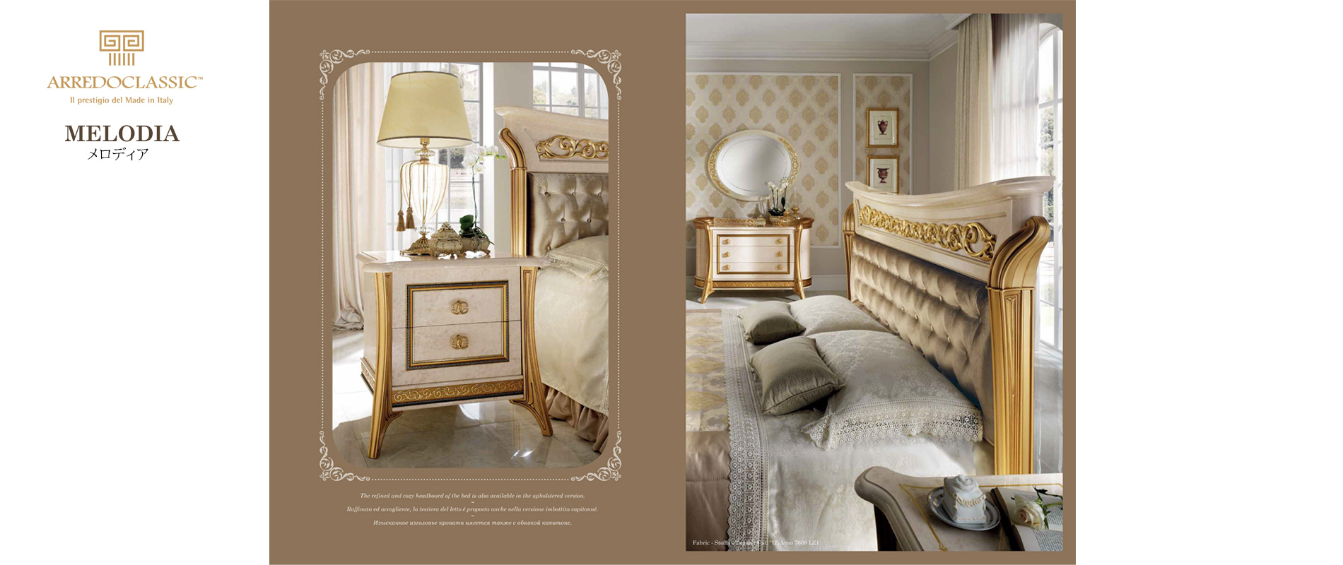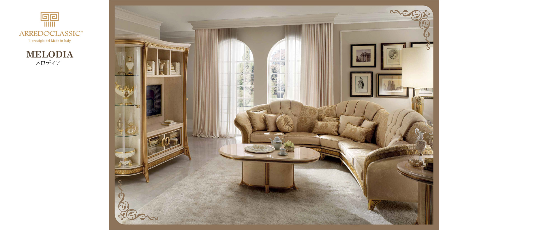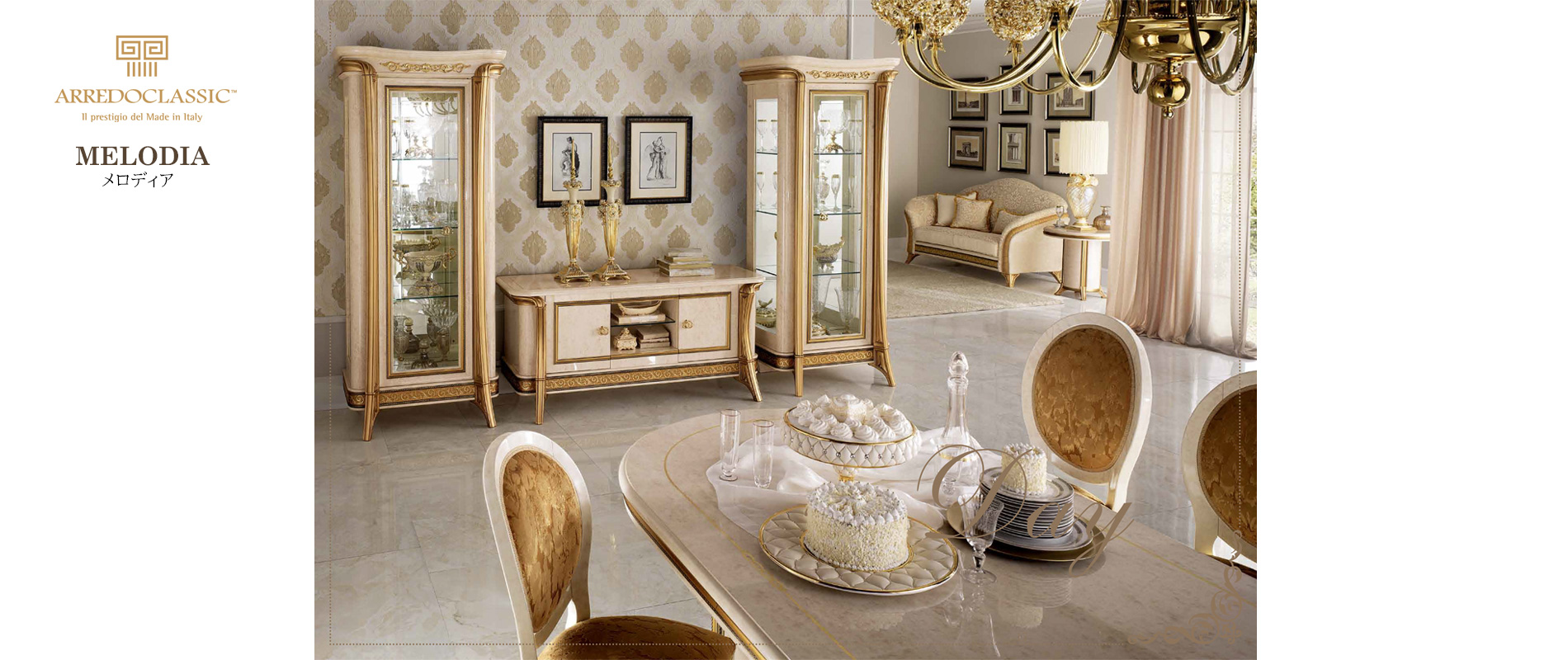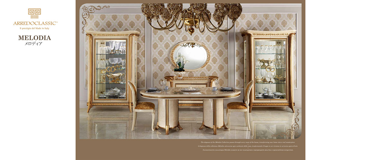 メロディアコレクションは、革新的な発想をもとに誕生したイタリア製家具シリーズです。クラシックなイタリアンスタイルに新たな息吹をもたらし、伝統とモダンが調和する独自の美を追求しています。柔らかくロマンティックな曲線美は、ネオクラシック様式の優雅な雰囲気を想起させます。アールデコのエッセンスが随所に散りばめられ、精緻なフリーズやアラベスク模様が家具のディテールを一層引き立てます。