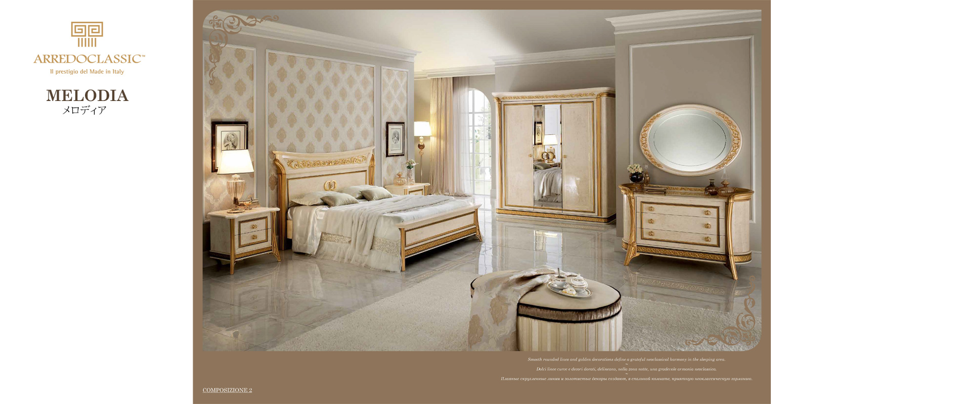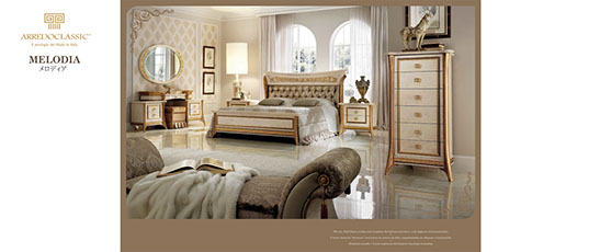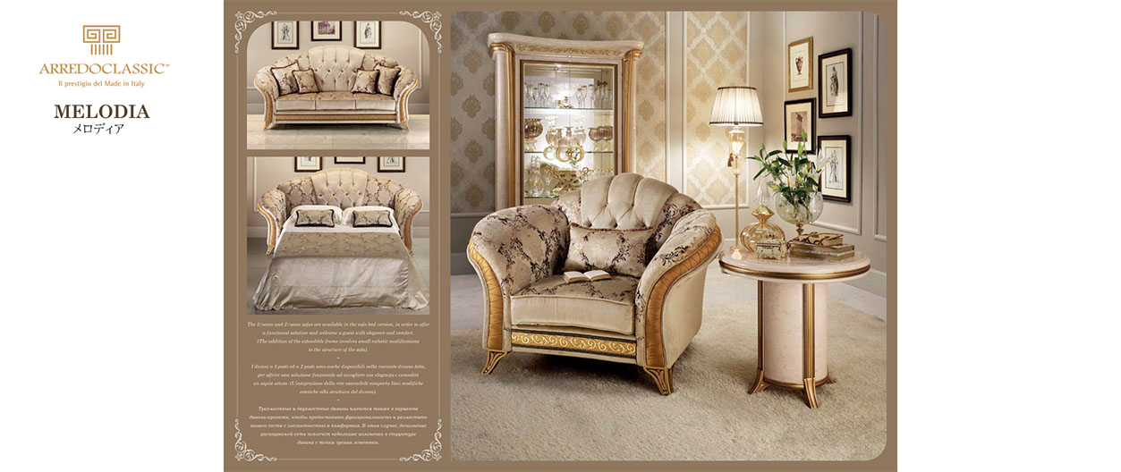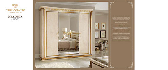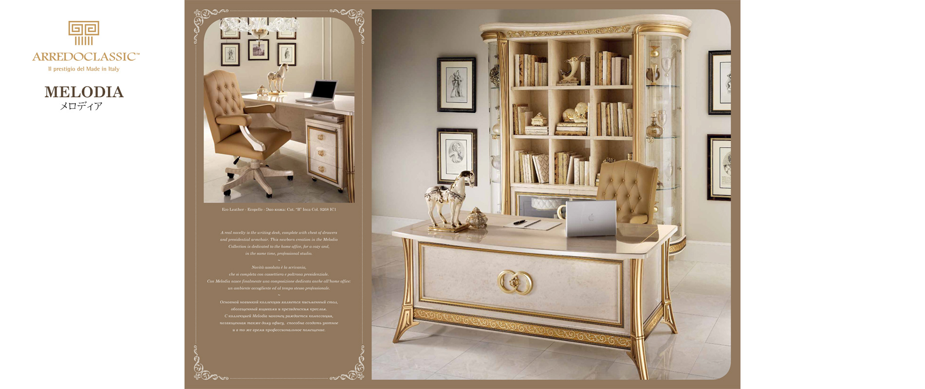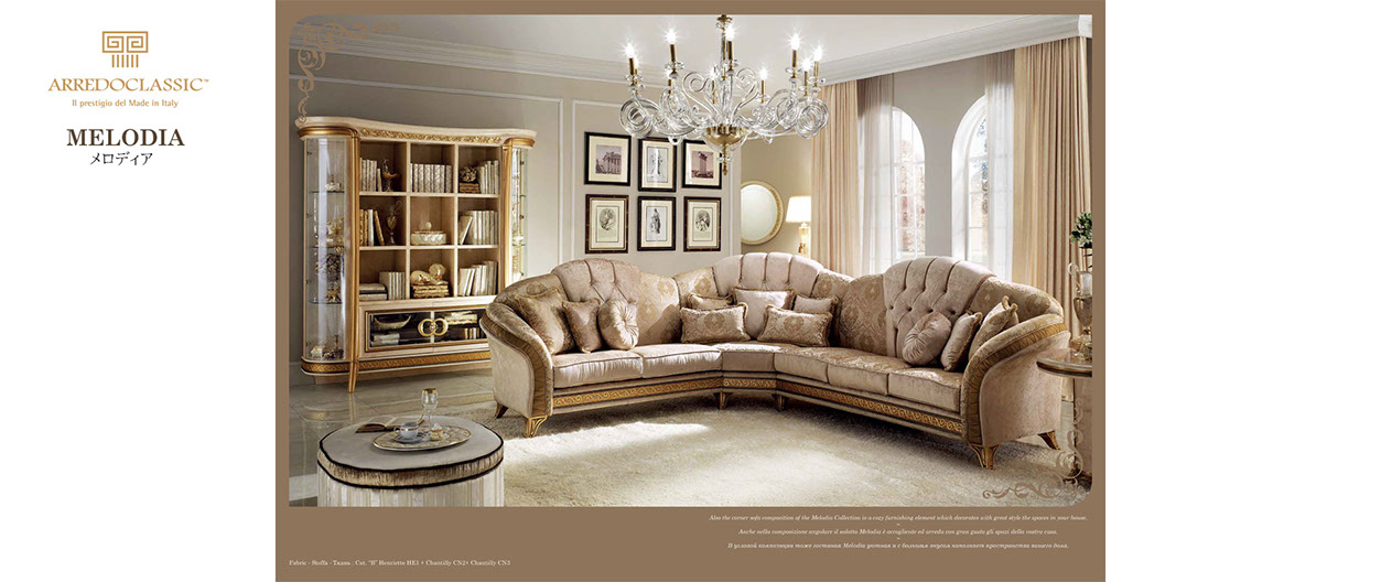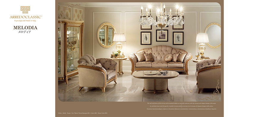 メロディアコレクションは、革新的な発想をもとに誕生したイタリア製家具シリーズです。クラシックなイタリアンスタイルに新たな息吹をもたらし、伝統とモダンが調和する独自の美を追求しています。柔らかくロマンティックな曲線美は、ネオクラシック様式の優雅な雰囲気を想起させます。アールデコのエッセンスが随所に散りばめられ、精緻なフリーズやアラベスク模様が家具のディテールを一層引き立てます。