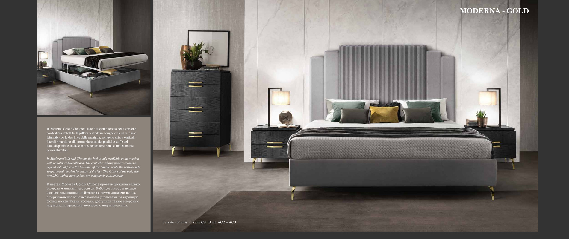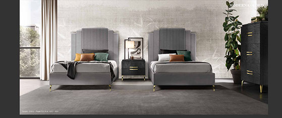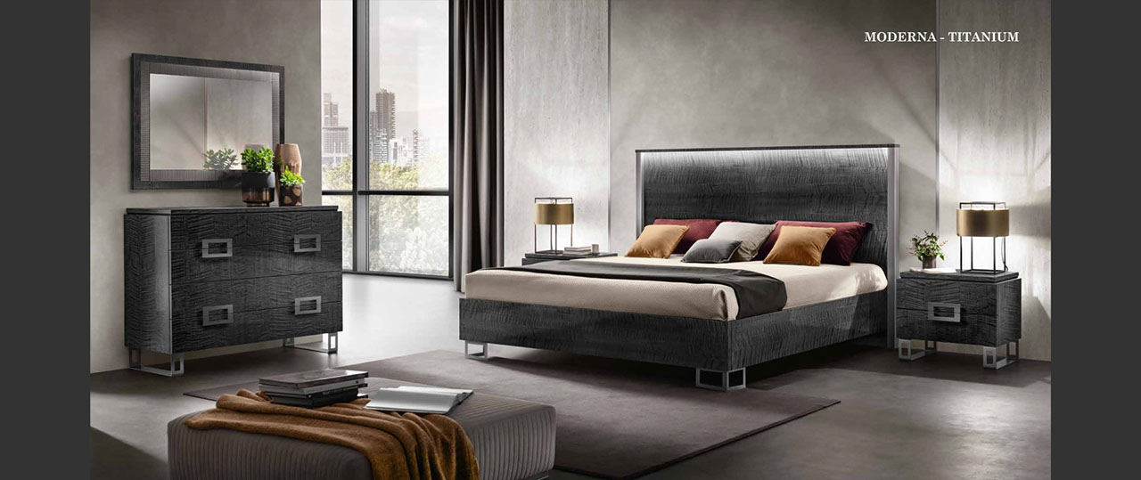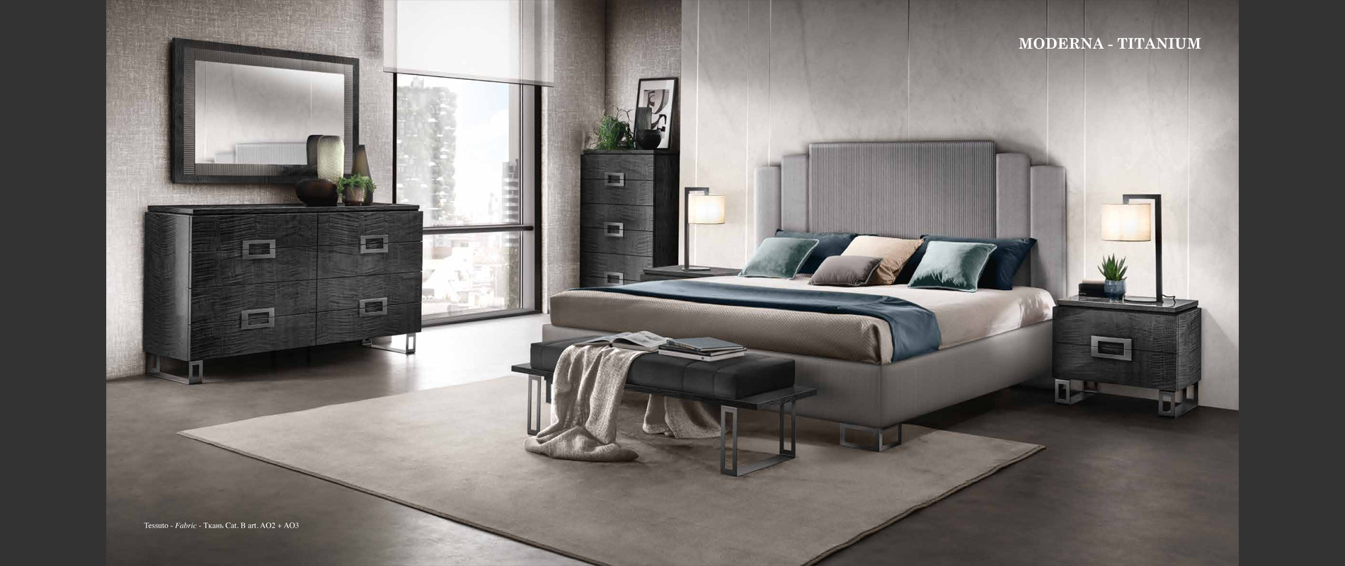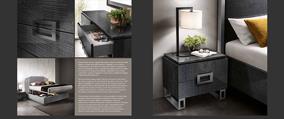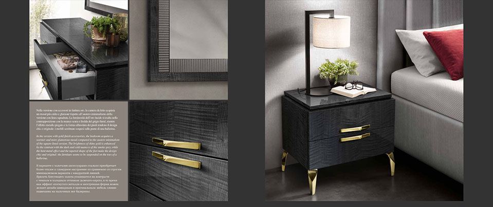 アドラの「モデルナ」コレクションが彩る寝室は、現代の荒々しさと、イタリアンデザインが持つ静かな気品が溶け合う舞台です。直線的で研ぎ澄まされた家具のラインは、空間に凛としたリズムを刻み、その上に重ねられた繊細な仕上げやエレガントなディテールが、ミニマルでありながら豊かな表情をもつ“静寂の美”を生み出します。すべての家具には、スモーキーグレーの光沢ラッカーをまとったシカモア材が使われ、柔らかな光を受けて、まるで霧の中から姿を現すように静かに輝きます。さらに、脚やハンドルなどのアクセサリーは、3つのスタイルとカラーバリエーションから選べるカスタマイズ性を備え、空間にあなた自身の美意識をそっと映し込むことができます