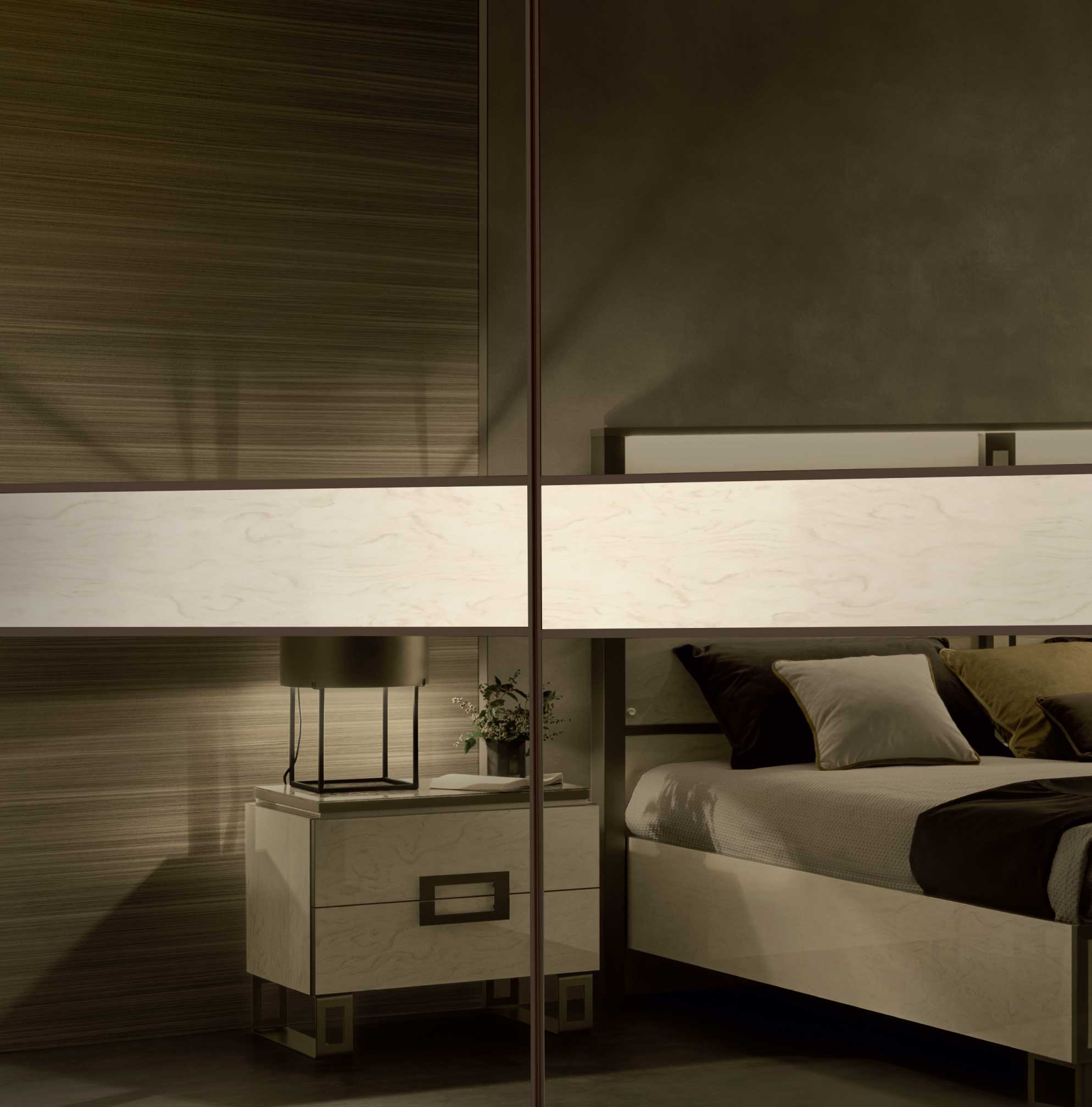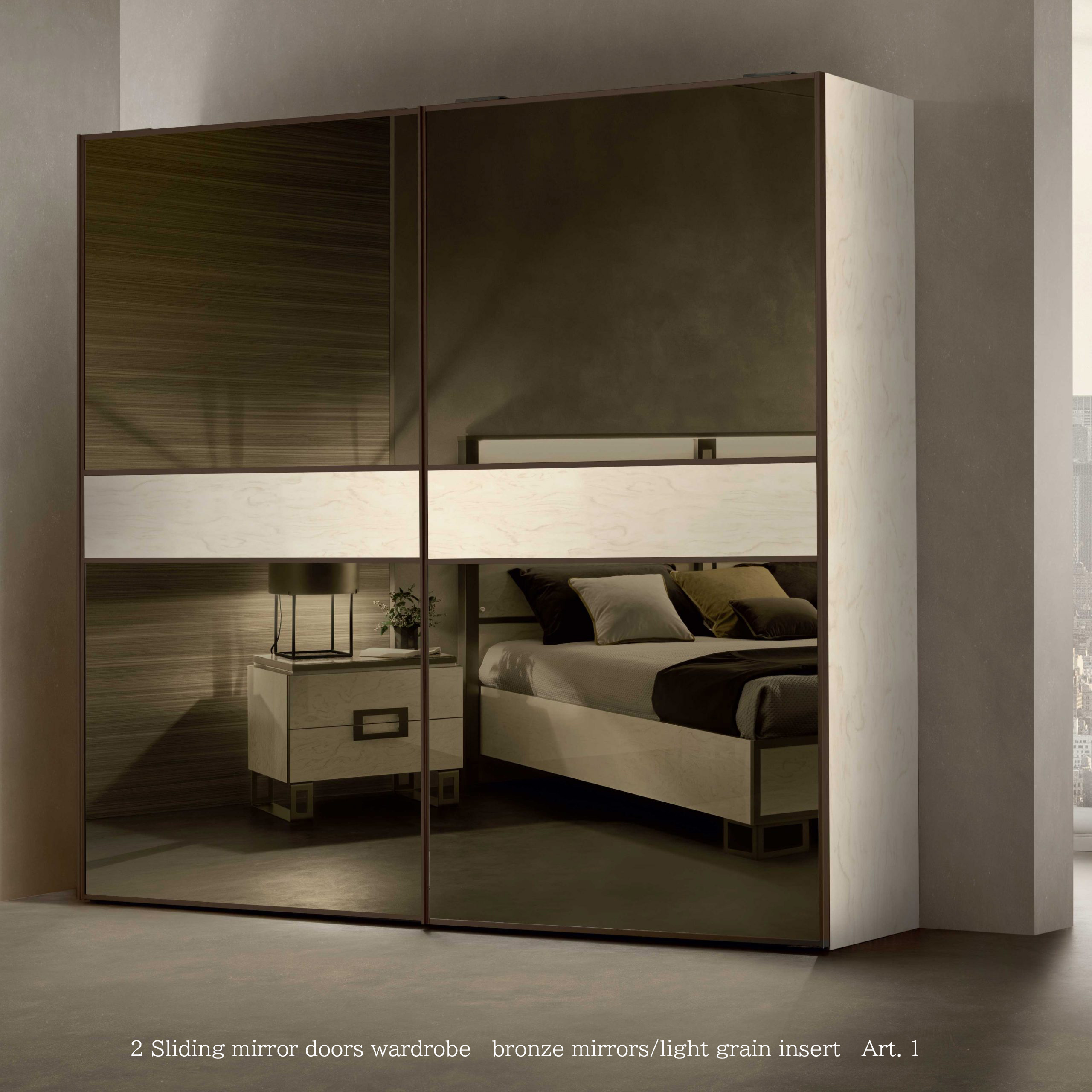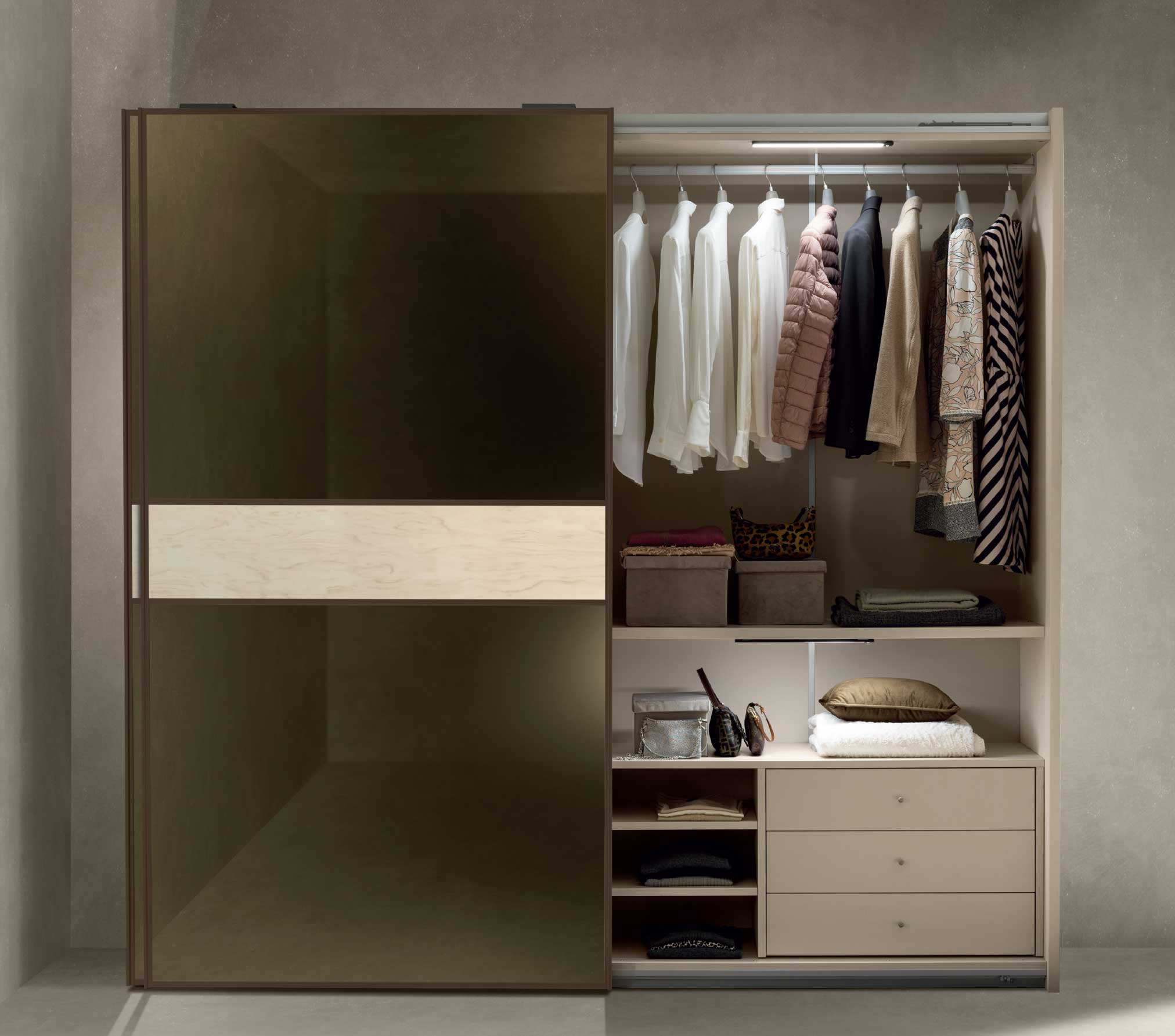 エレガントなPoesia(ポエジア)ワードローブは、頑丈なアルミプロファイルを使用した2つの大きな鏡面扉を備え、ソフトクロージング機能付きのガイドに沿ってスライドします。側面と棚板は35mmの厚みがあり、構造の堅牢性を確保しています。チェスト(オプション)は、ソフトクロージング機能付きの引き出しが3つあり、底部はベルベットの裏地付きです。スライディング ドアのミラーカラー表面処理材のカラーモードも変更可能です。壁面への埋め込みなども可能でおしゃれに美しく演出いたします。